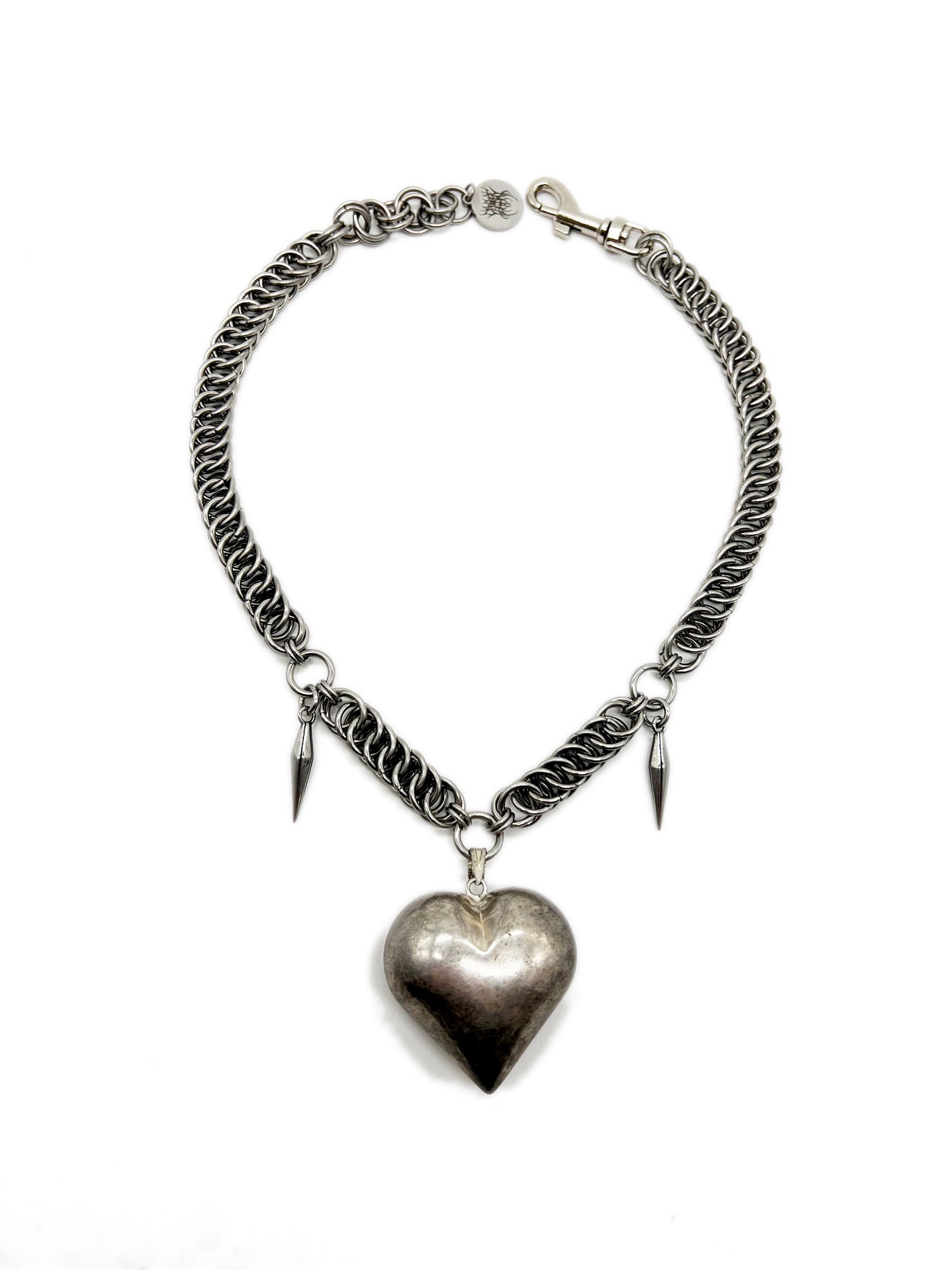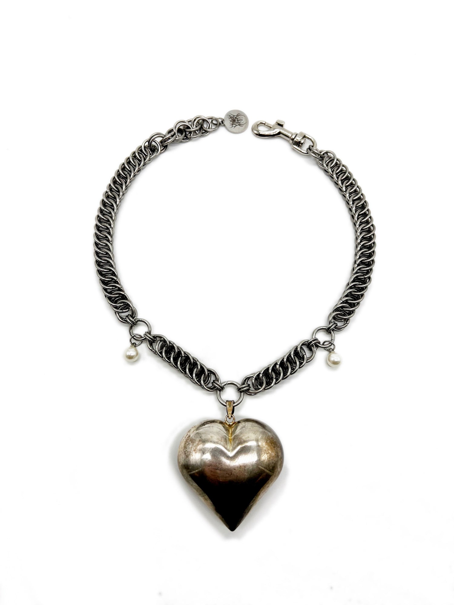 Super Unique Heavy Duty Chainmail Necklace Featuring A Large silver toned metal heart ornament decorated with your choice of stainless steel spikes or plastic pearl charm details at either side. Includes a 1.5" nickel plated clasp, a stainless steel Carnage in Bloom brand jewelry tag, and up to 1.5" of adjustable length.