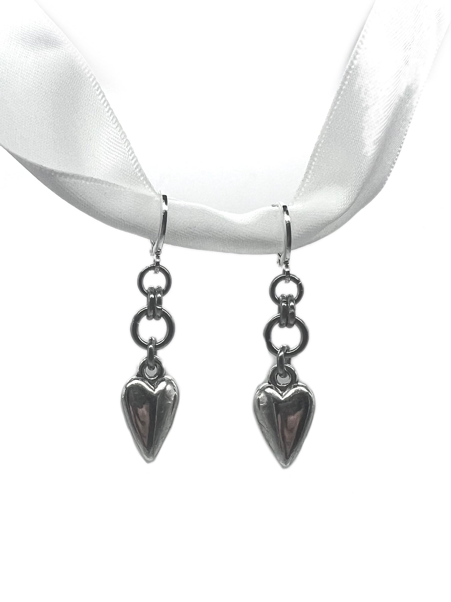 Metal Sweet Hearts on a mini o-ring connected to a round lever back nickel free earring hook for pierced or stretched ears.