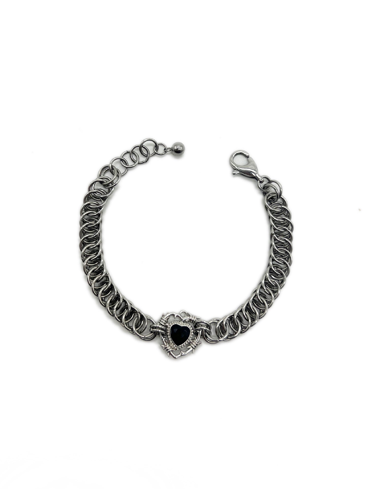 Dainty Stainless Steel Bracelet in the "Centipede" Weave with a black and silver sacred heart charm with barbed wire details at the center completed with a stainless steel lobster claw clasp, 1/2 Inches of adjustable length, and a stainless steel bead.