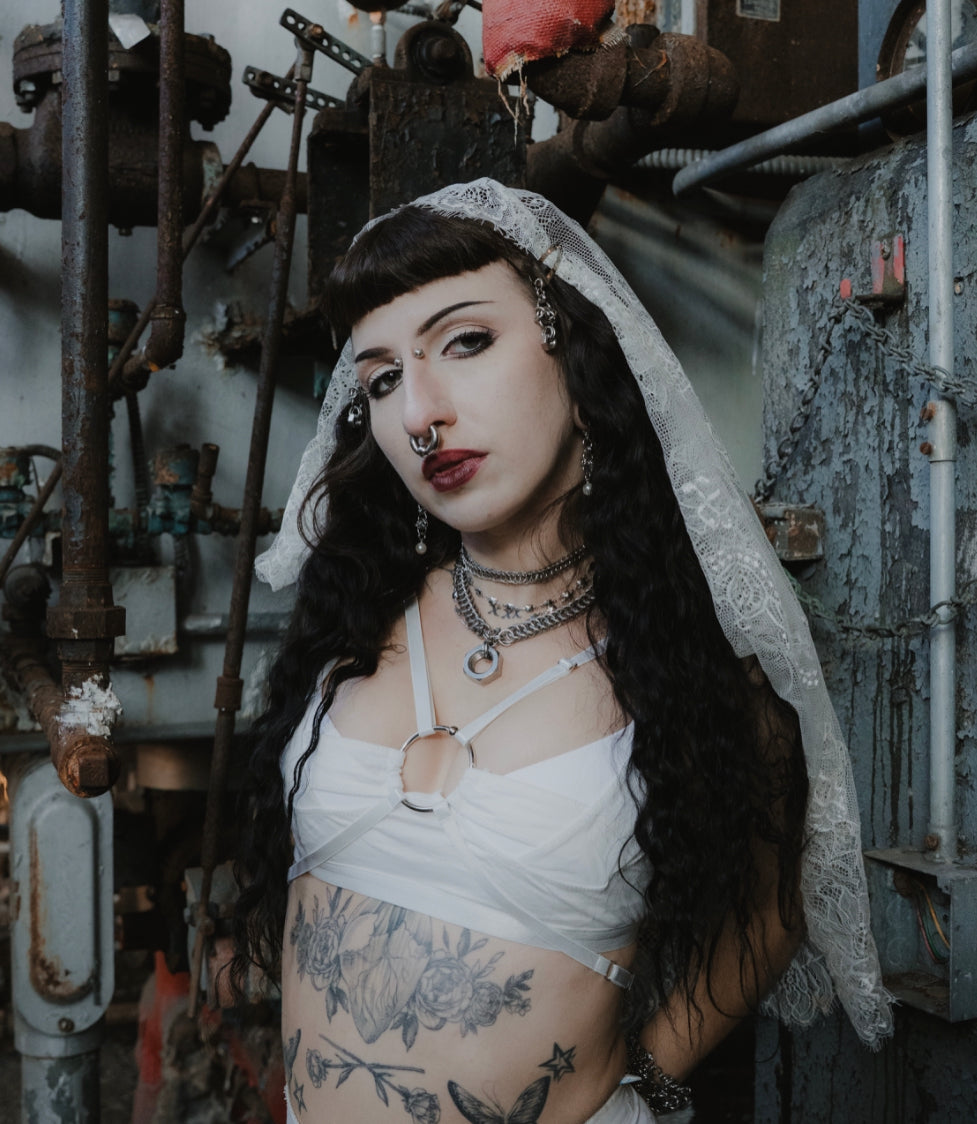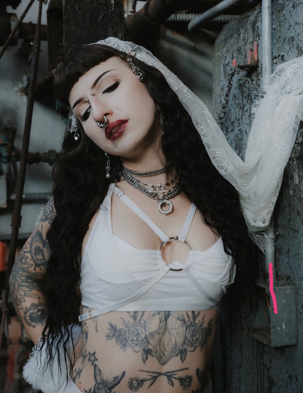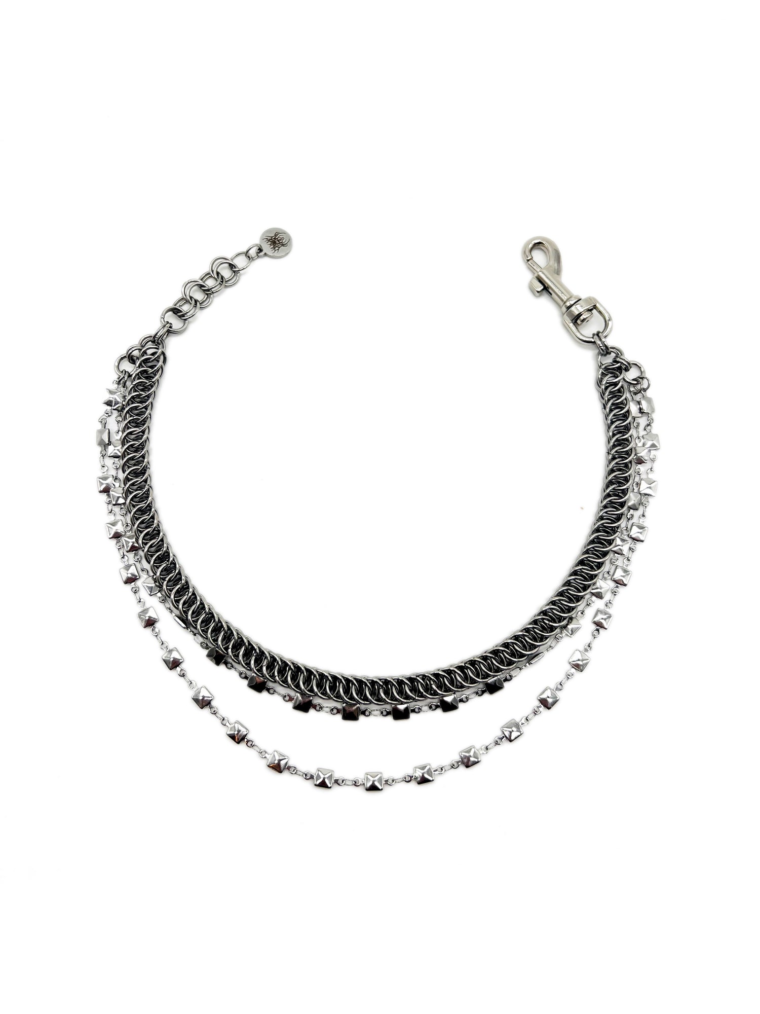Dainty Stainless Steel Chainmail Choker decorated with two layered strands of stainless steel machine made chain with stud details. Includes a 1.5" nickel plated clasp, a stainless steel Carnage in Bloom brand jewelry tag, and up to 1.5" of adjustable length.