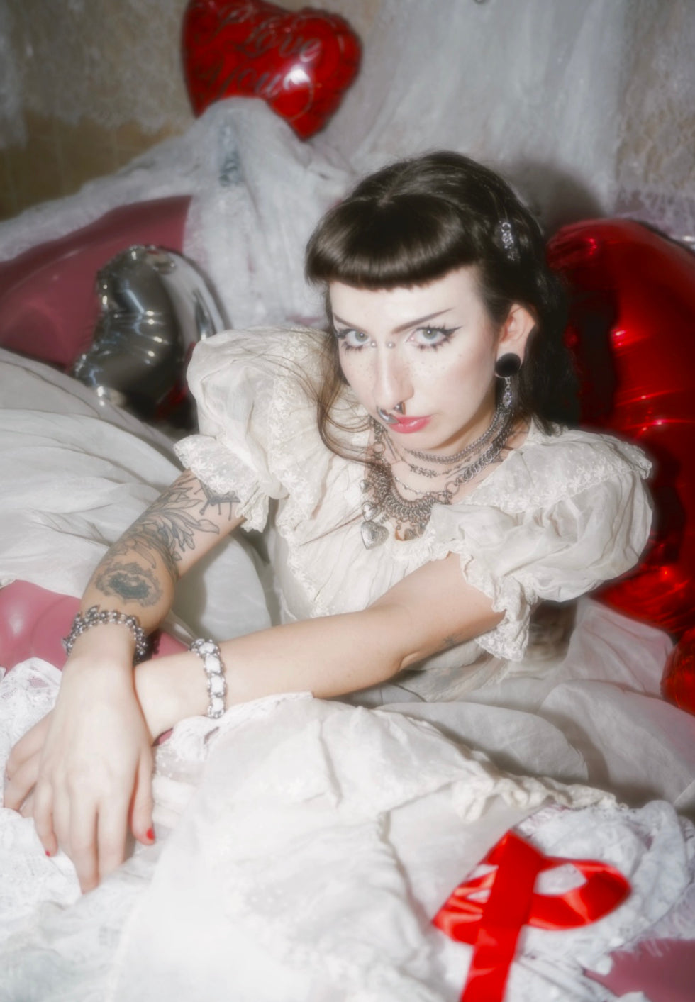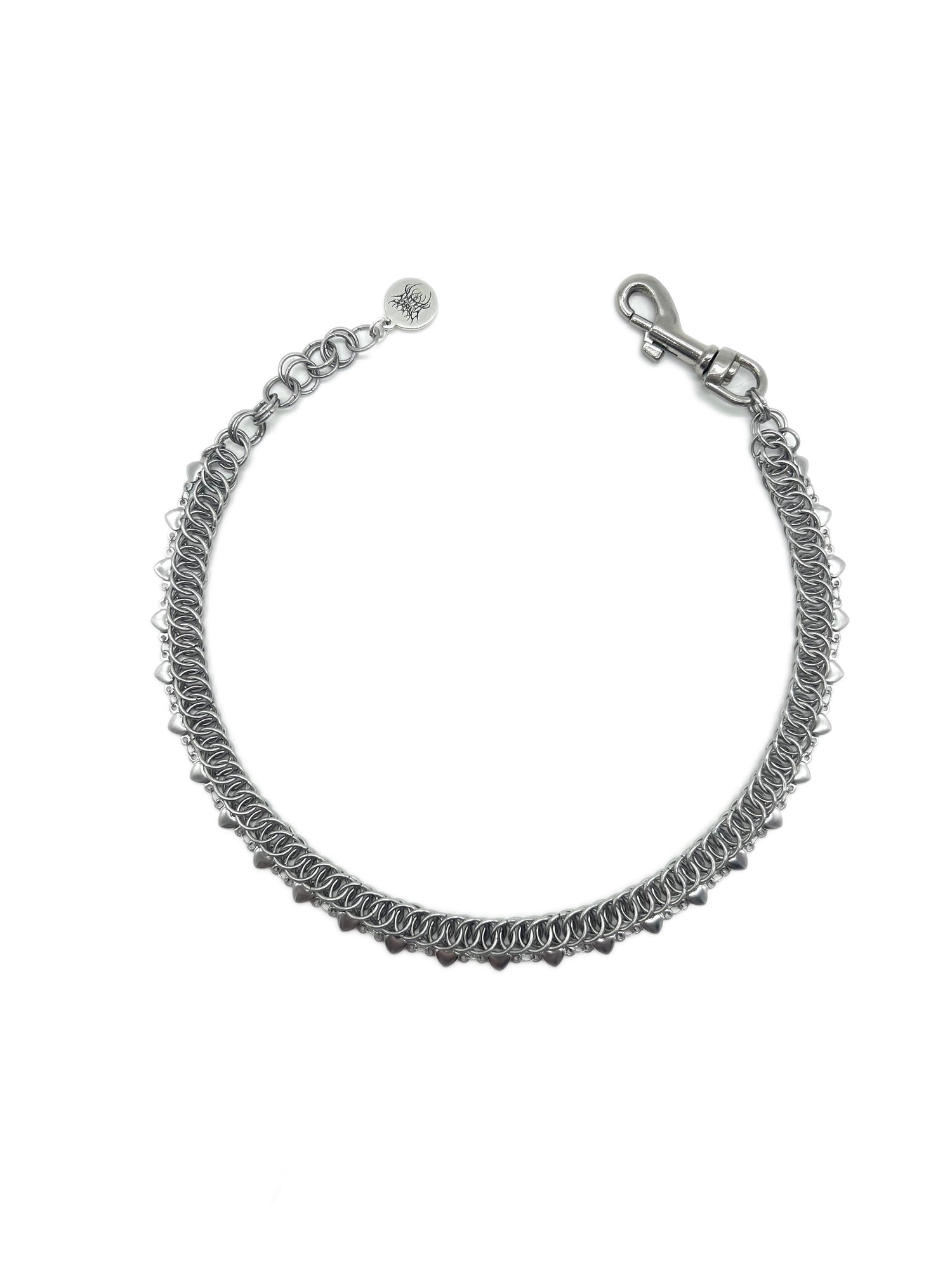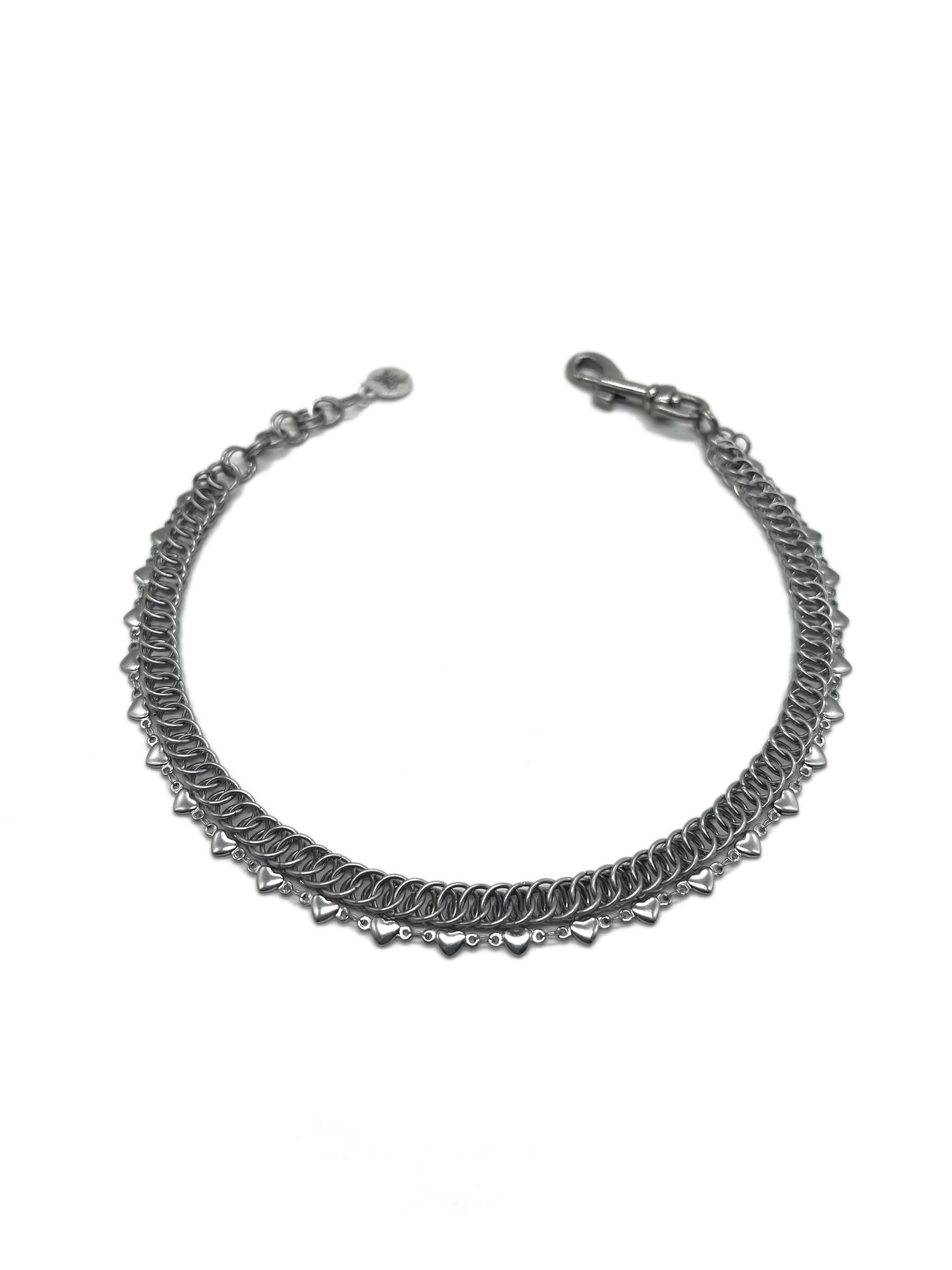 Dainty Stainless Steel Chainmail Choker decorated with a layered strand of stainless steel machine made chain with heart details. Includes a 1.5" nickel plated clasp, a stainless steel Carnage in Bloom brand jewelry tag, and up to 1.5" of adjustable length.