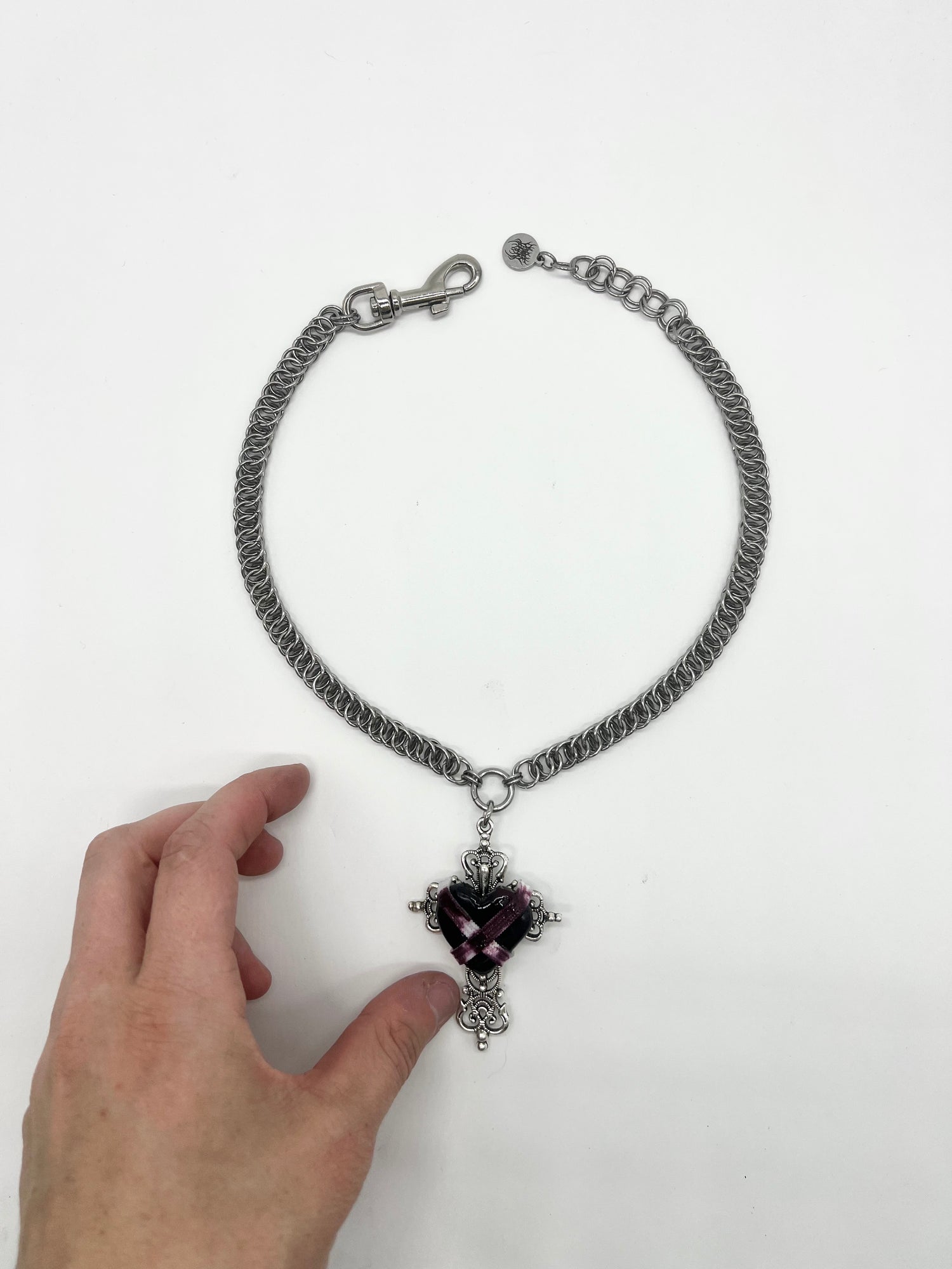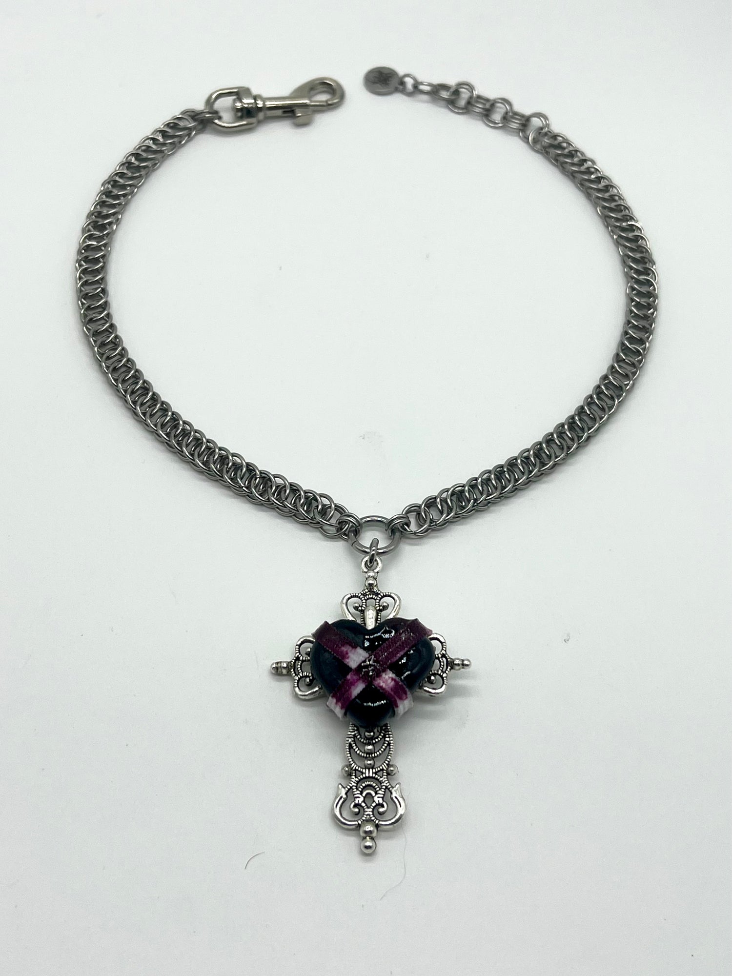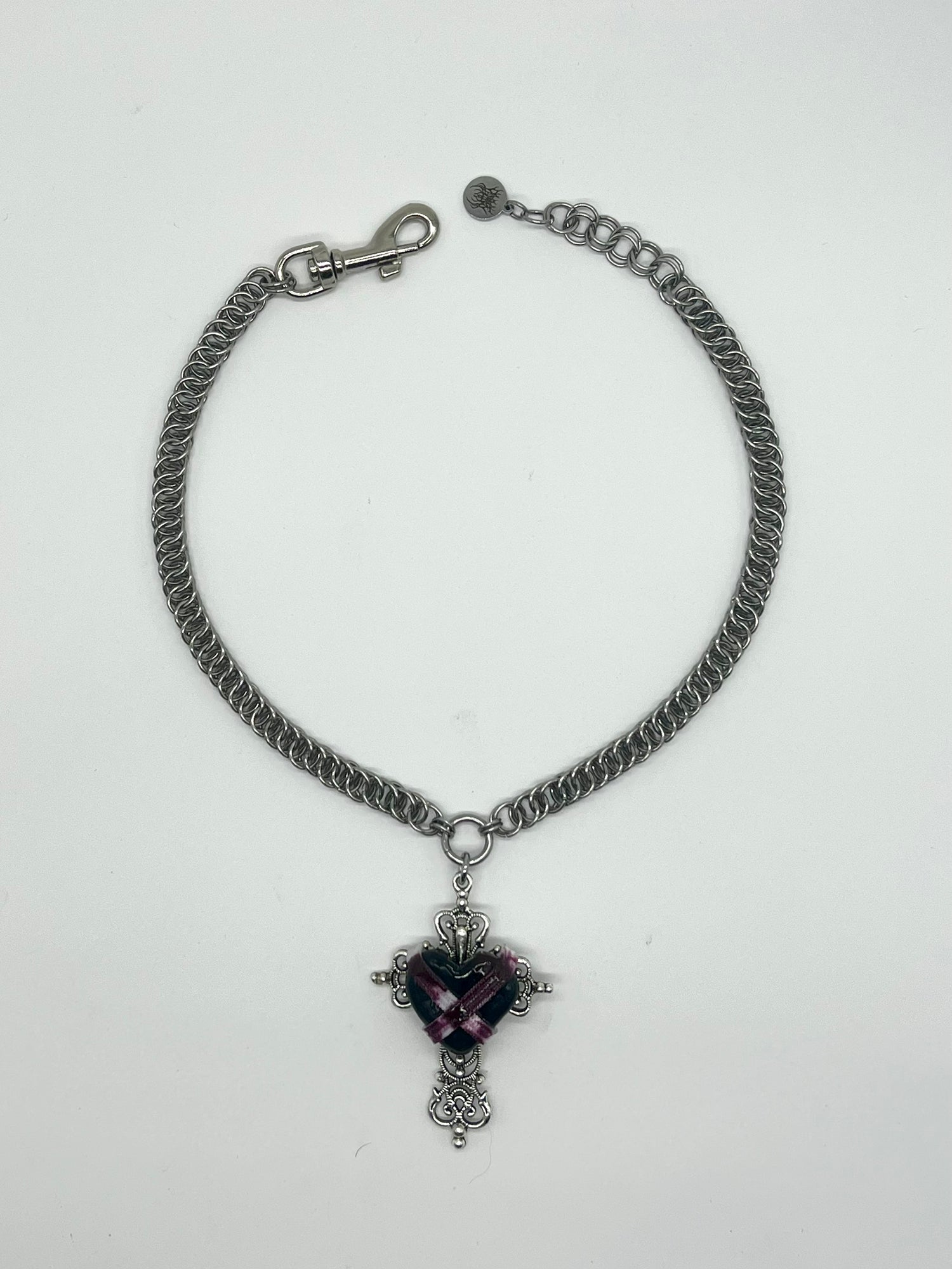 Decorative Stainless Steel Chainmail Choker in the "Centipede" Weave Featuring a Black Heart Pendant with blood splatter on a silver toned cross with bandage details handcrafted by @Grave_Works at the center accompanied by plastic pearls and stainless steel beads at either side of the chain. Includes a 1.5" nickel plated clasp, a stainless steel Carnage in Bloom brand jewelry tag, and up to 1.5" of adjustable length.