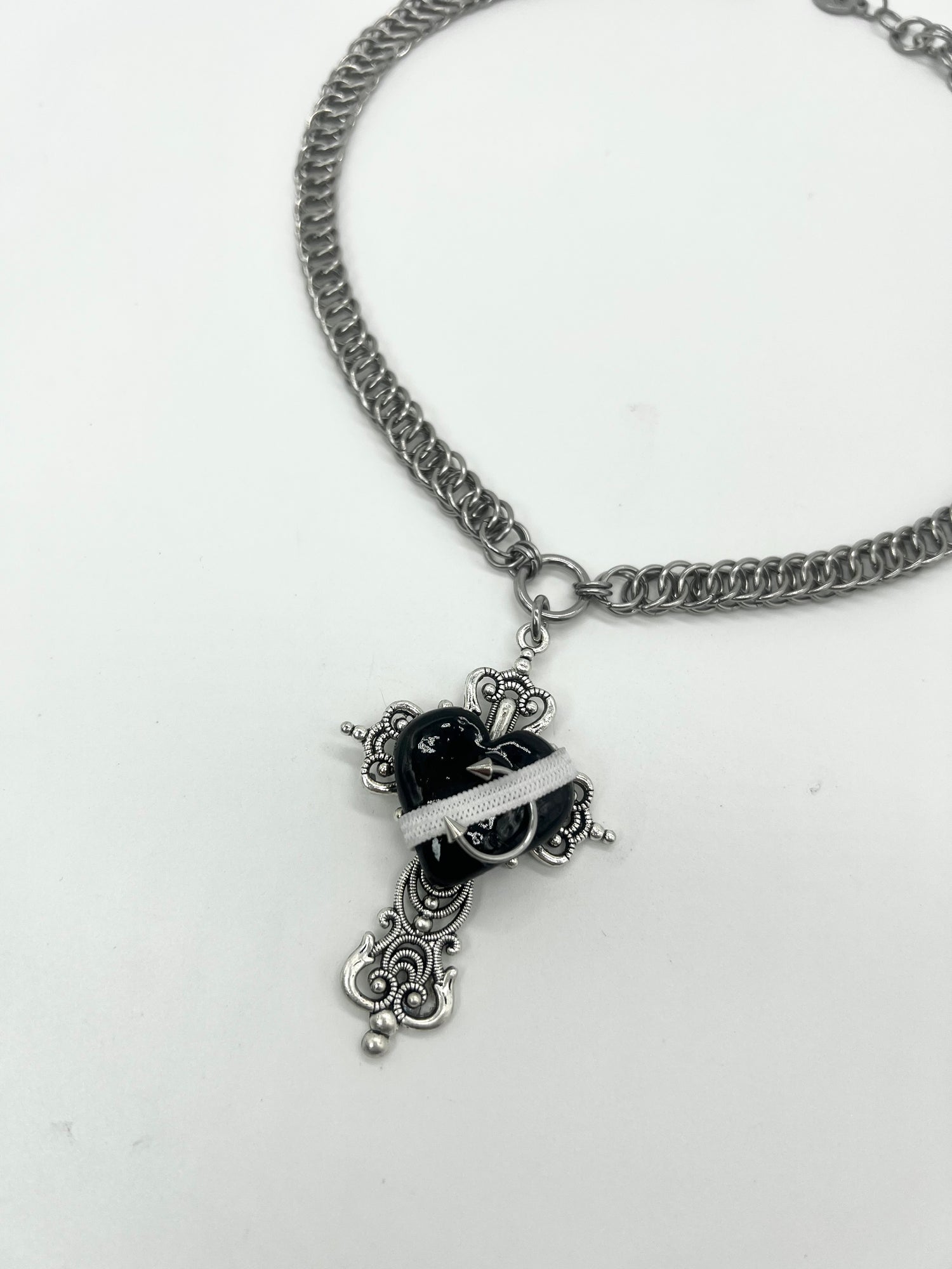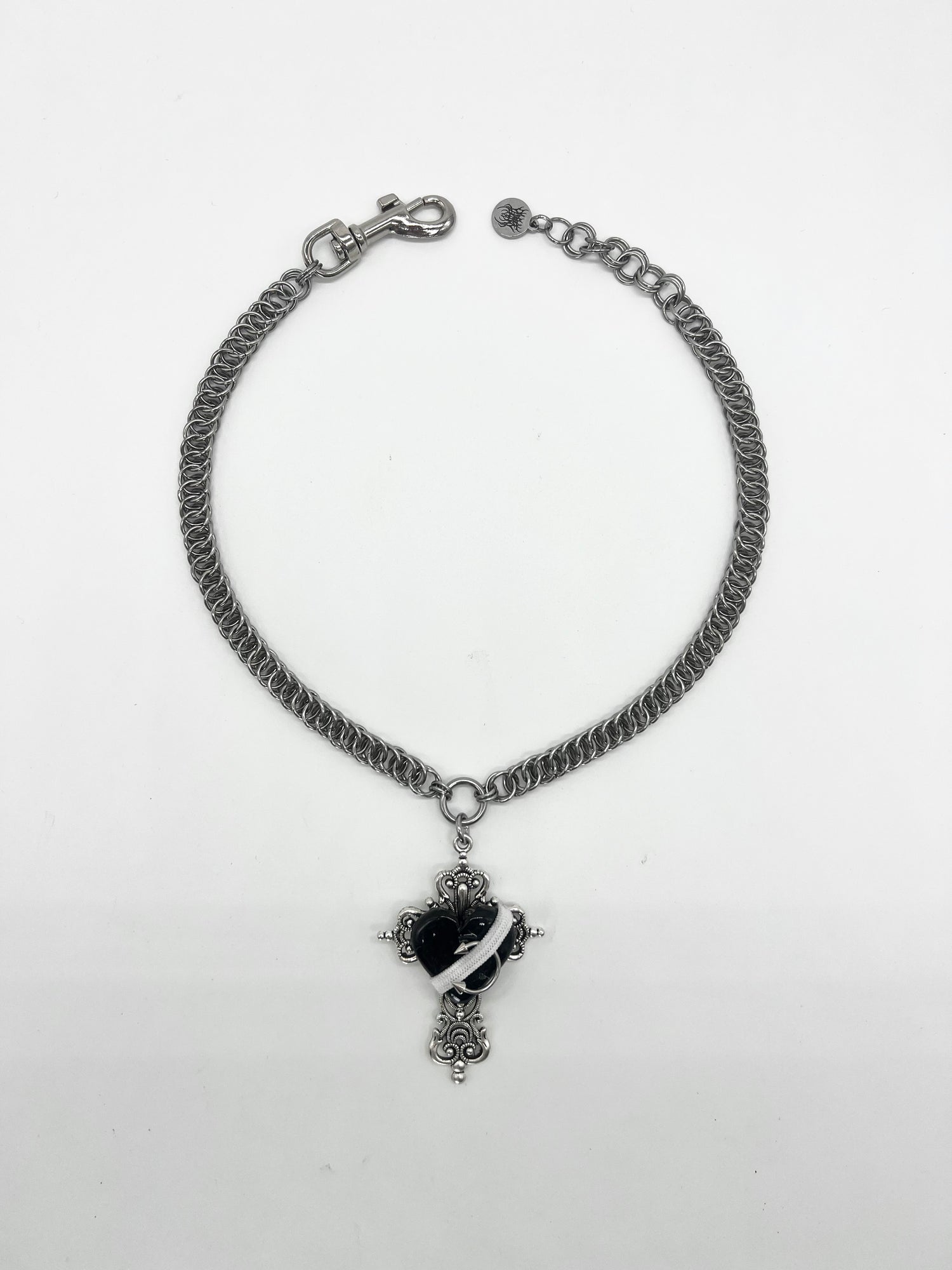 Decorative Stainless Steel Chainmail Choker in the "Centipede" Weave Featuring a Black Heart Pendant with a spike barbell and bandage on a silver toned cross handcrafted by @Grave_Works at the center. Includes a 1.5" nickel plated clasp, a stainless steel Carnage in Bloom brand jewelry tag, and up to 1.5" of adjustable length.