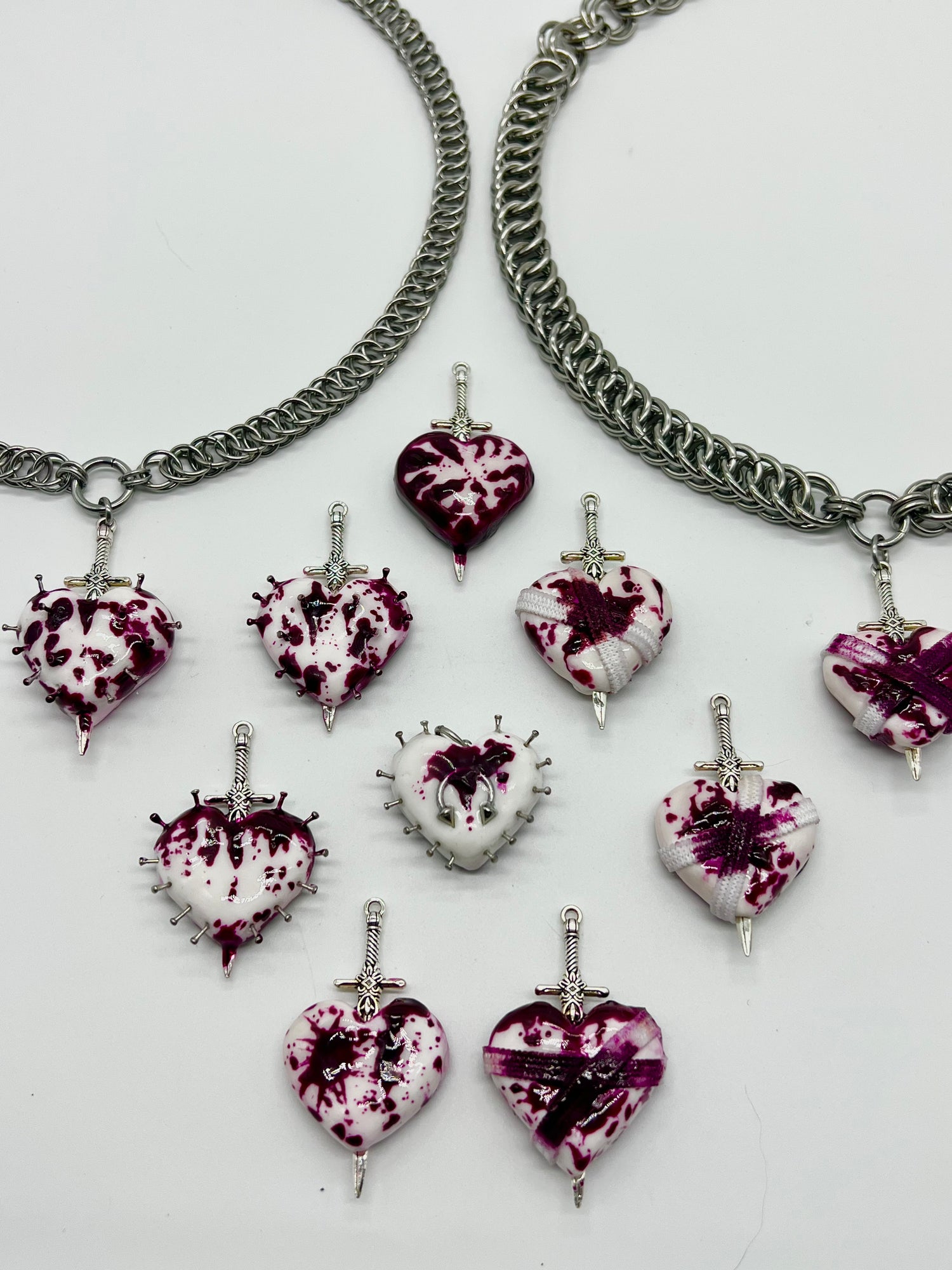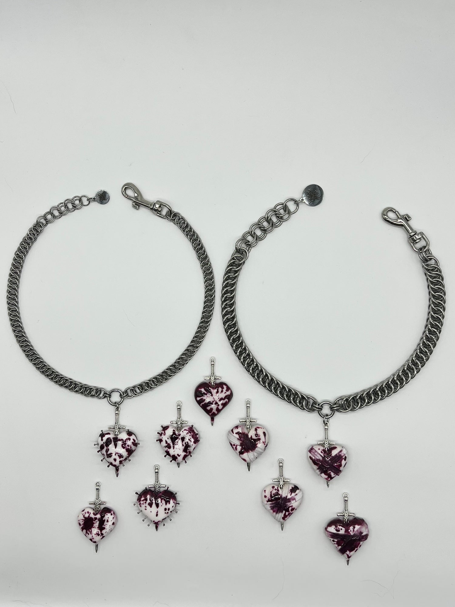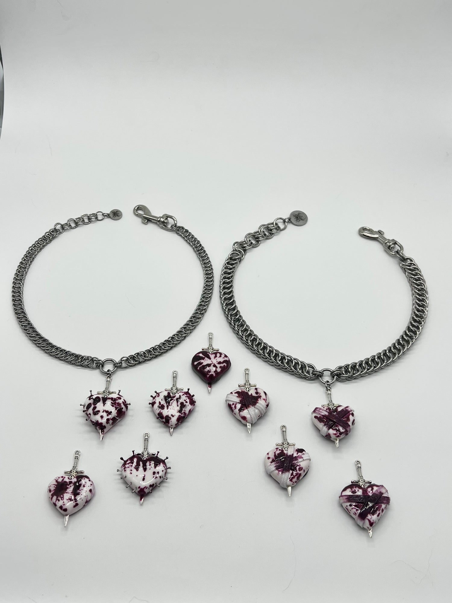 Decorative Stainless Steel Chainmail Choker in the "Viper" or "Centipede" Weave Featuring a White Heart Pendant with blood splatter, silver pin and/or bandage details and a zinc alloy sword through the middle handcrafted by @Grave_Works. Includes a 1.5" nickel plated clasp, a stainless steel Carnage in Bloom brand jewelry tag, and up to 1.5" of adjustable length.