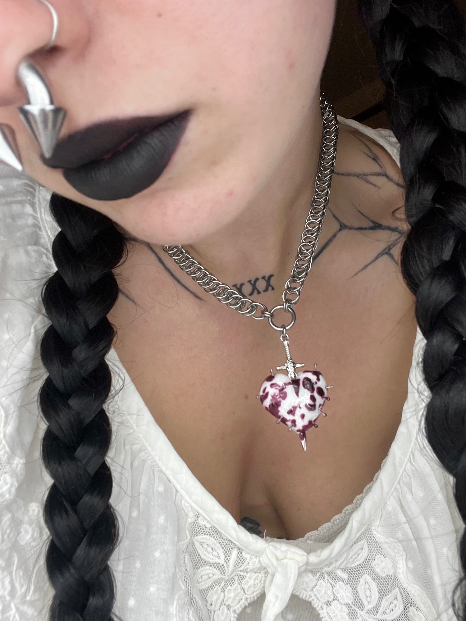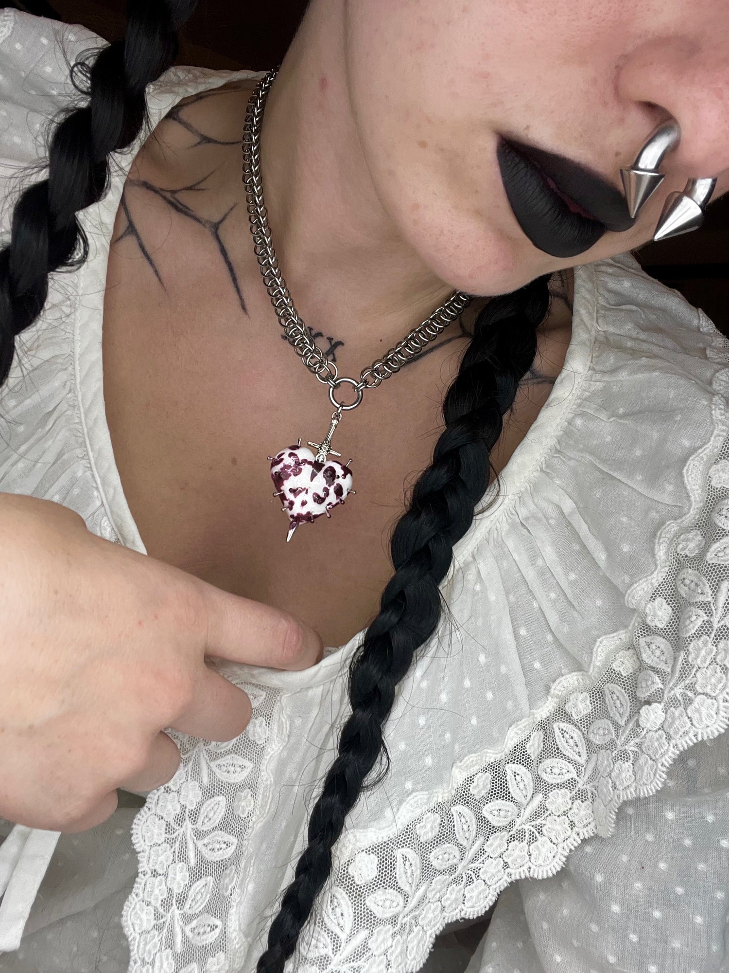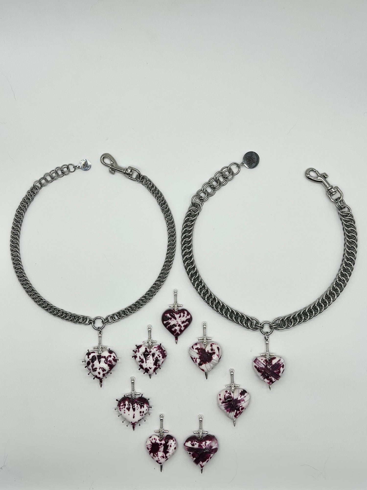 Decorative Stainless Steel Chainmail Choker in the "Viper" or "Centipede" Weave Featuring a White Heart Pendant with blood splatter, silver pin and/or bandage details and a zinc alloy sword through the middle handcrafted by @Grave_Works. Includes a 1.5" nickel plated clasp, a stainless steel Carnage in Bloom brand jewelry tag, and up to 1.5" of adjustable length.