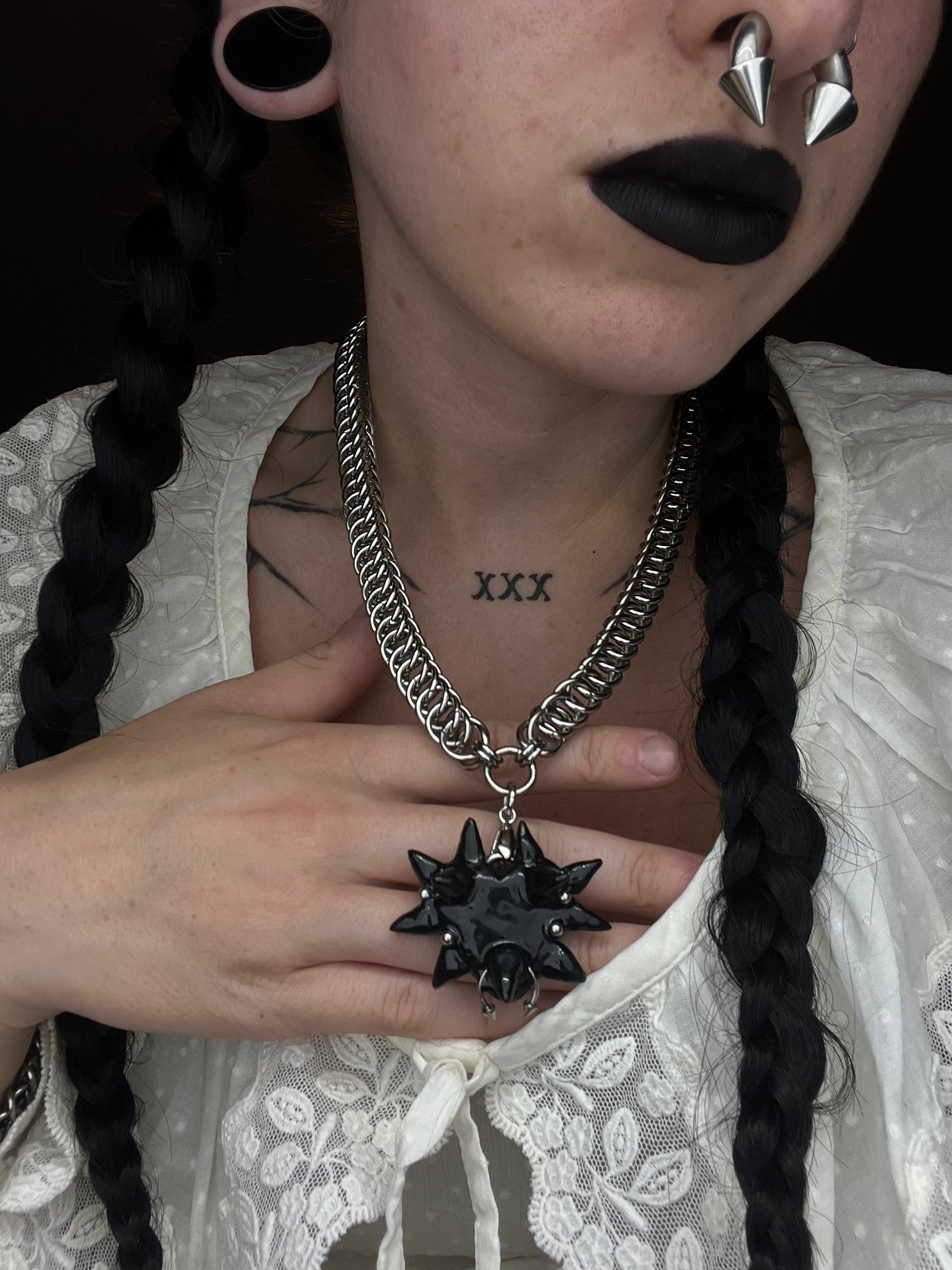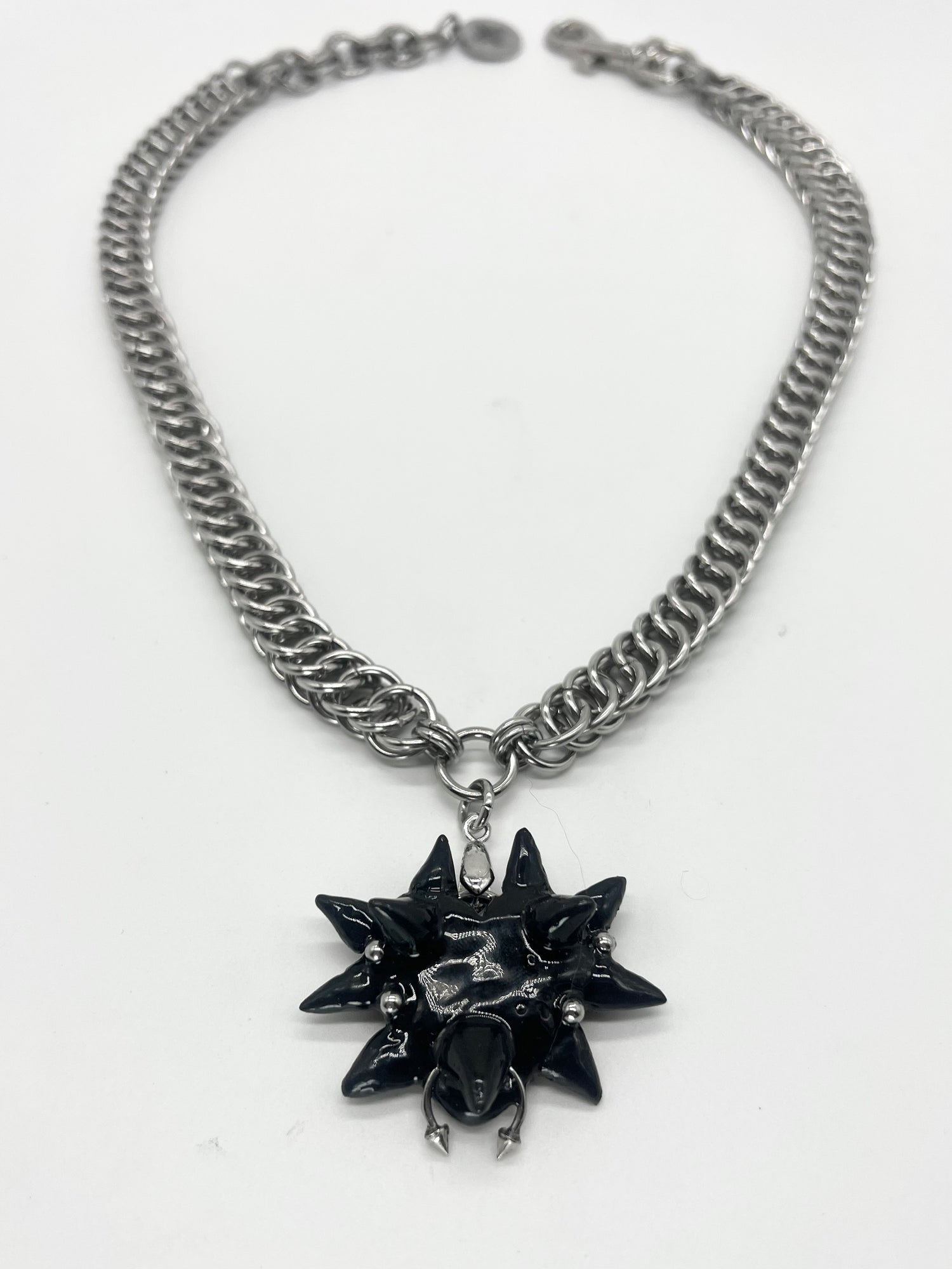 Heavy Duty Stainless Steel Chainmail Choker in the "Viper" Weave Featuring a Black spikey heart pendant with piercing details handcrafted by @Grave_Works at the center. Includes a 1.5" nickel plated clasp, a stainless steel Carnage in Bloom brand jewelry tag, and up to 1.5" of adjustable length.