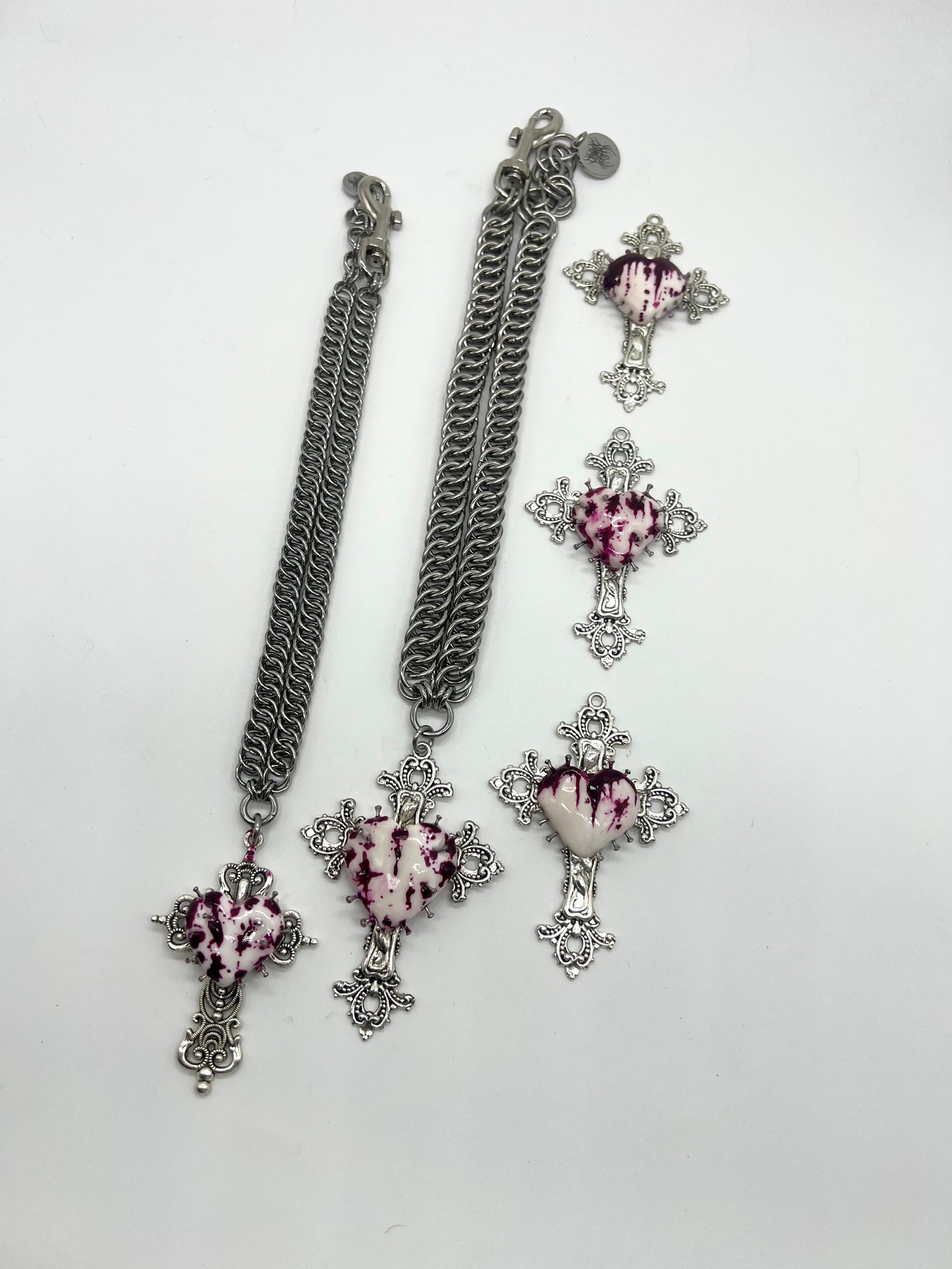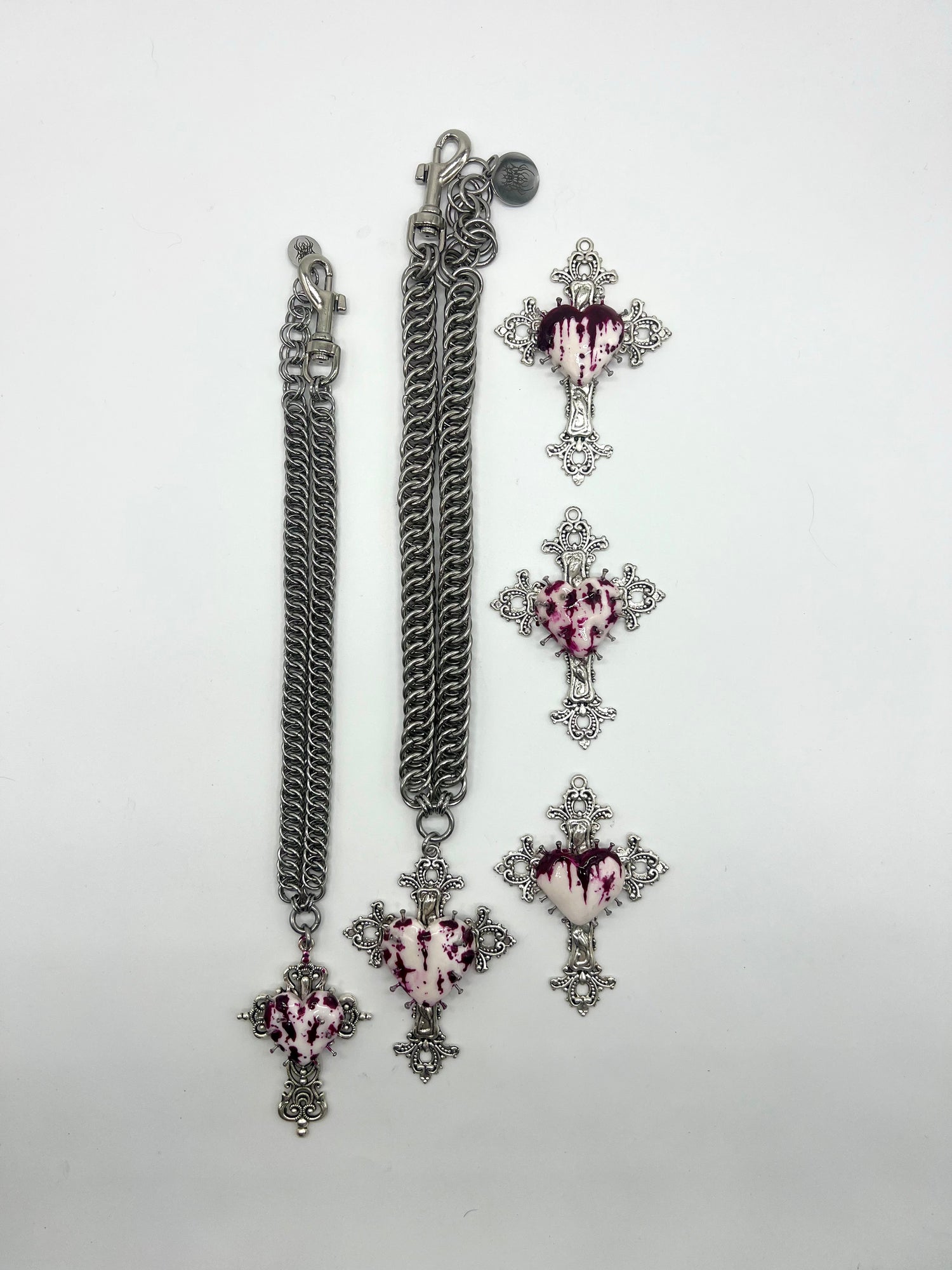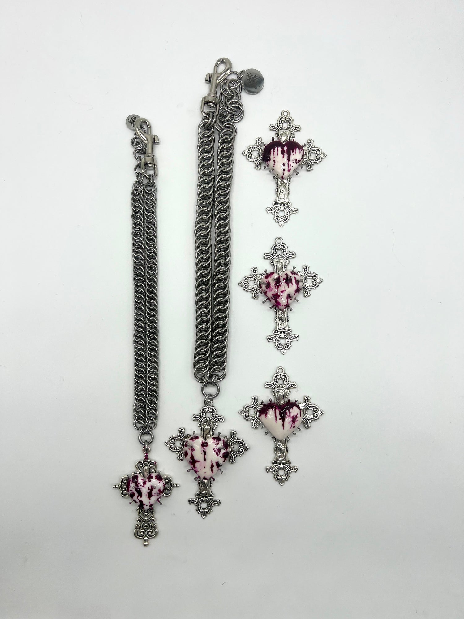 Decorative Stainless Steel Chainmail Choker in the "Viper" or "Centipede" Weave Featuring a White Heart Pendant with blood splatter on a silver toned cross with silver pin details handcrafted by @Grave_Works at the center. Includes a 1.5" nickel plated clasp, a stainless steel Carnage in Bloom brand jewelry tag, and up to 1.5" of adjustable length.