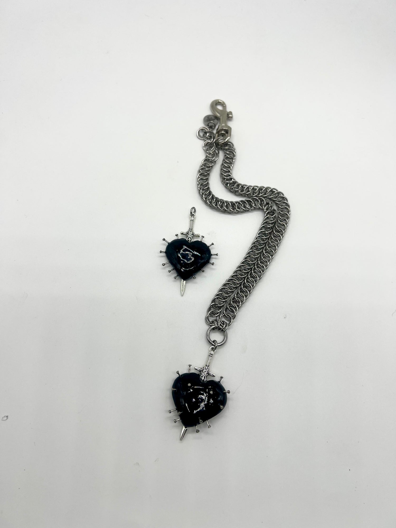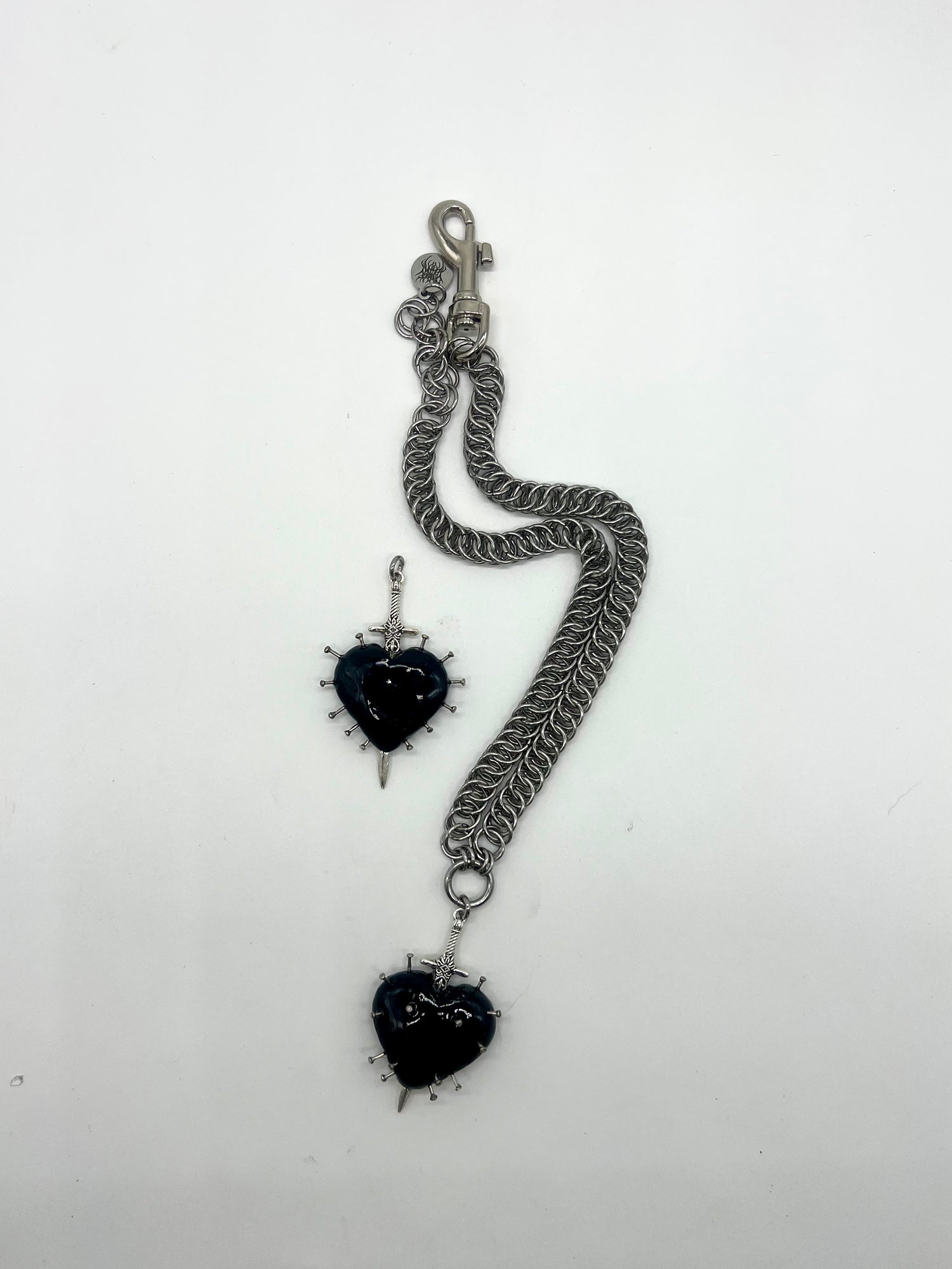 Decorative Stainless Steel Chainmail Choker in the "Centipede" Weave Featuring a Black Heart Pendant with pin details on a silver toned cross handcrafted by @Grave_Works at the center. Includes a 1.5" nickel plated clasp, a stainless steel Carnage in Bloom brand jewelry tag, and up to 1.5" of adjustable length.