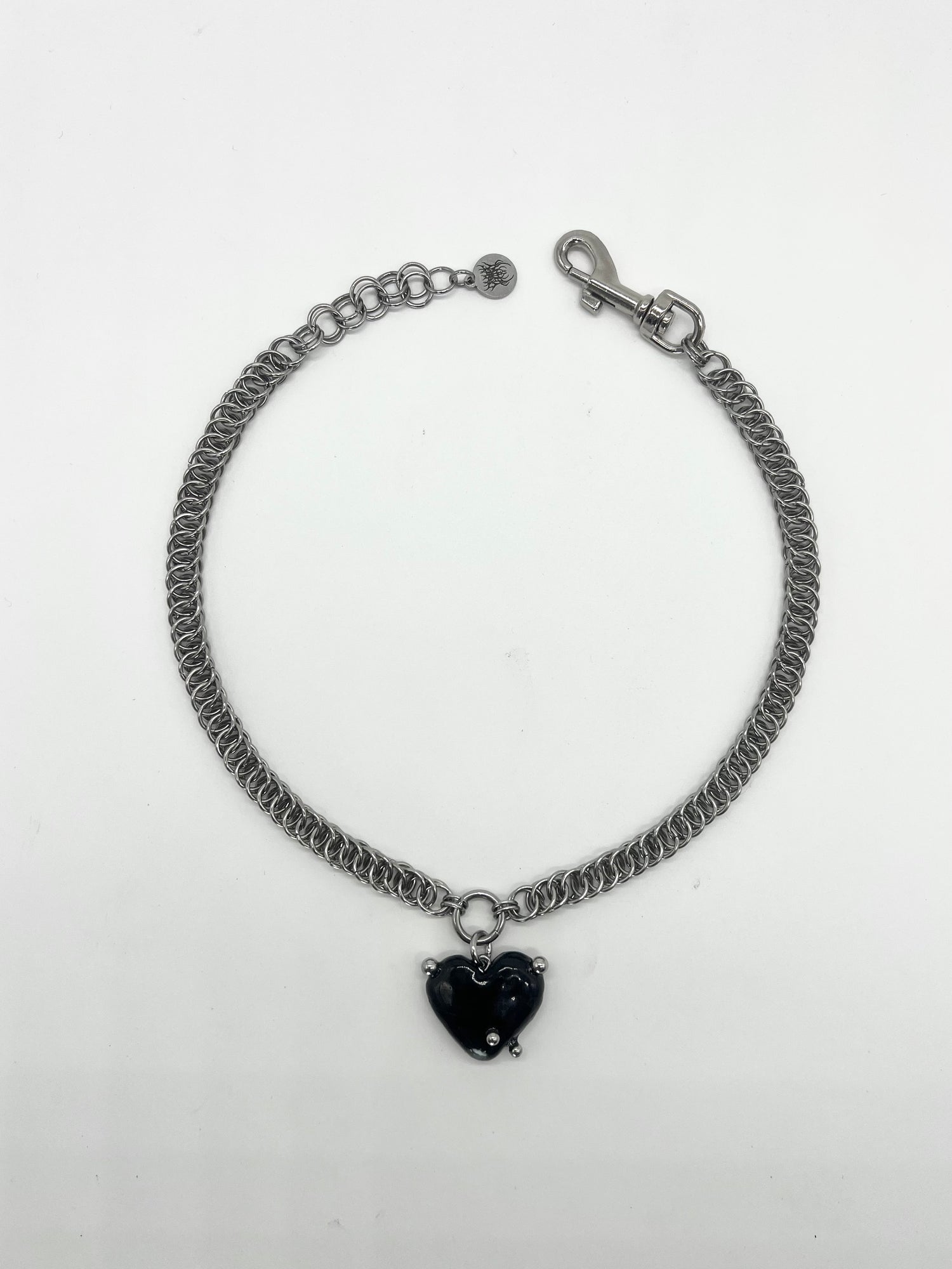 Decorative Stainless Steel Chainmail Choker in the "Centipede" Weave Featuring a Black Heart Pendant with Piercing bead details handcrafted by @Grave_Works at the center. Includes a 1.5" nickel plated clasp, a stainless steel Carnage in Bloom brand jewelry tag, and up to 1.5" of adjustable length.