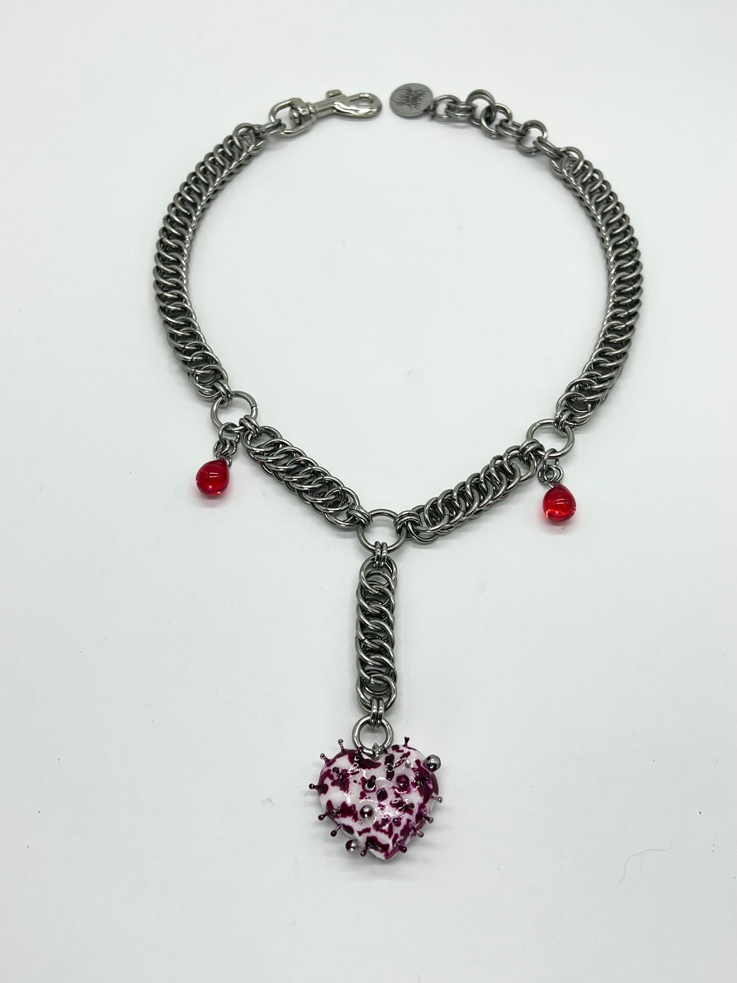 Decorative Stainless Steel Chainmail Rosary Shaped Necklace in the "Viper" Weave Featuring a White blood splattered heart with pin and piercing bead details handcrafted by @Grave_Works at the center with red glass beads at either side. Includes a 1.5" nickel plated clasp, a stainless steel Carnage in Bloom brand jewelry tag, and up to 1.5" of adjustable length.