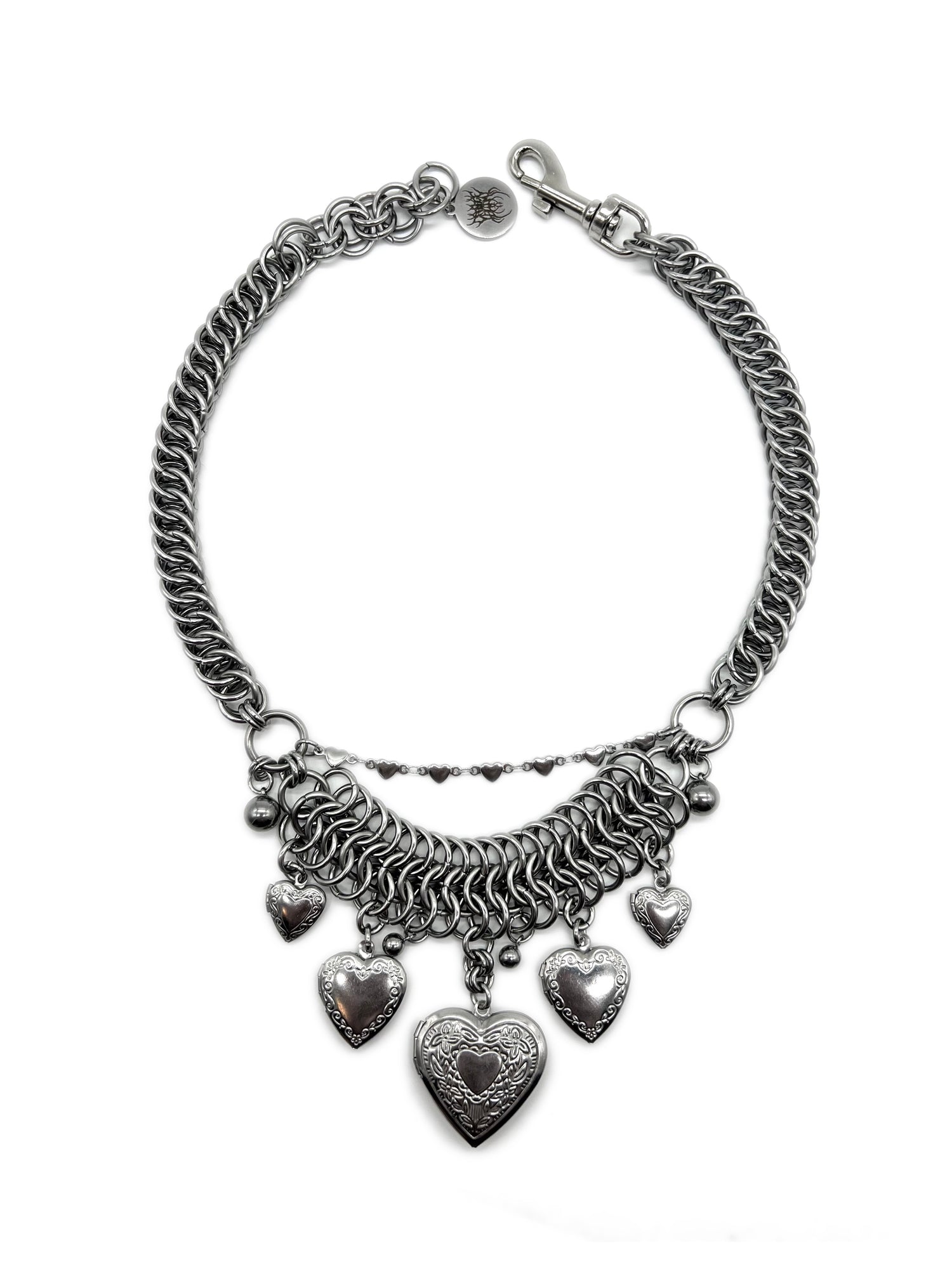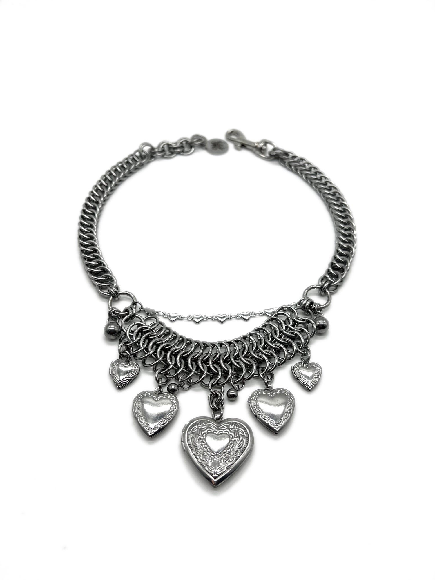 Heavy Duty Stainless Steel Chainmail Necklace Composed of Viper Weave and Coastal Carpet at the center decorated with beads, heart shaped machine made chain, and finished with five stainless steel lockets of various sizes to represent your five boyfriends!! Includes a 1.5" nickel plated clasp, a stainless steel Carnage in Bloom brand jewelry tag, and up to 1.5" of adjustable length.