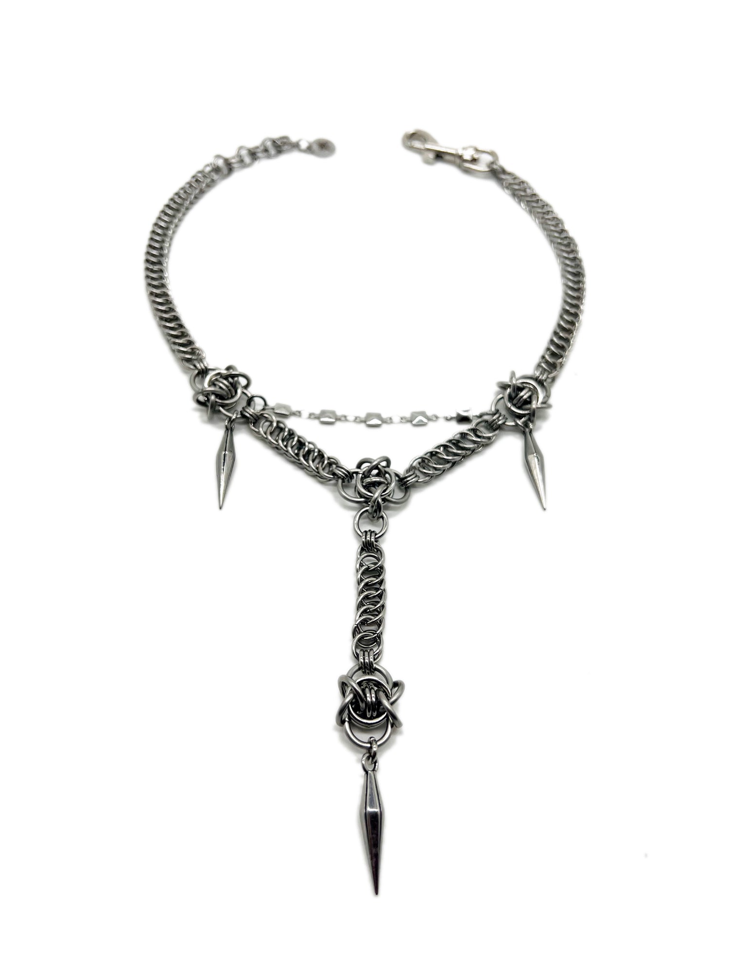 Romantic Stainless Steel Chainmail Necklace Composed of "Centipede" Chain segmented by four chainmail barbed wire knots in a rosary shape decorated with machine made studded chain at the middle and three detailed stainless steel spikes. Fundamental hardware includes a nickel plated clasp, stainless steel branded jewelry tag, and 1.5" of extra adjustable length.
