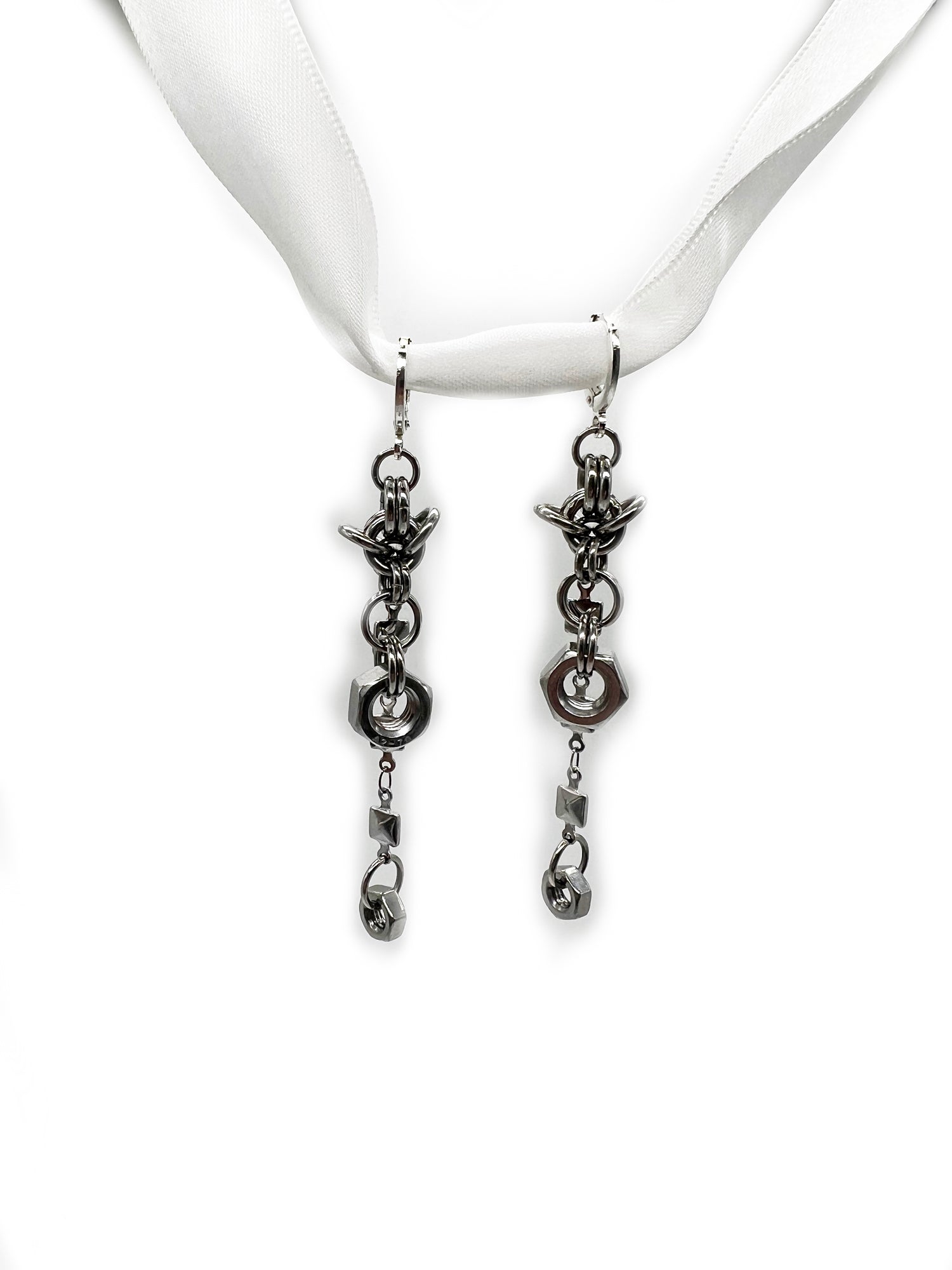Decorative chainmail earrings featuring two stainless steel hex nuts and machine made chain with square stud details dangling from a mini chainmail bouquet on a round lever back nickel free earring hook for pierced or stretched ears.