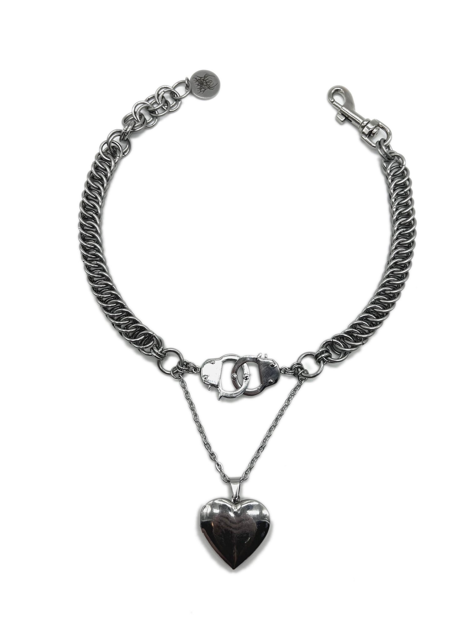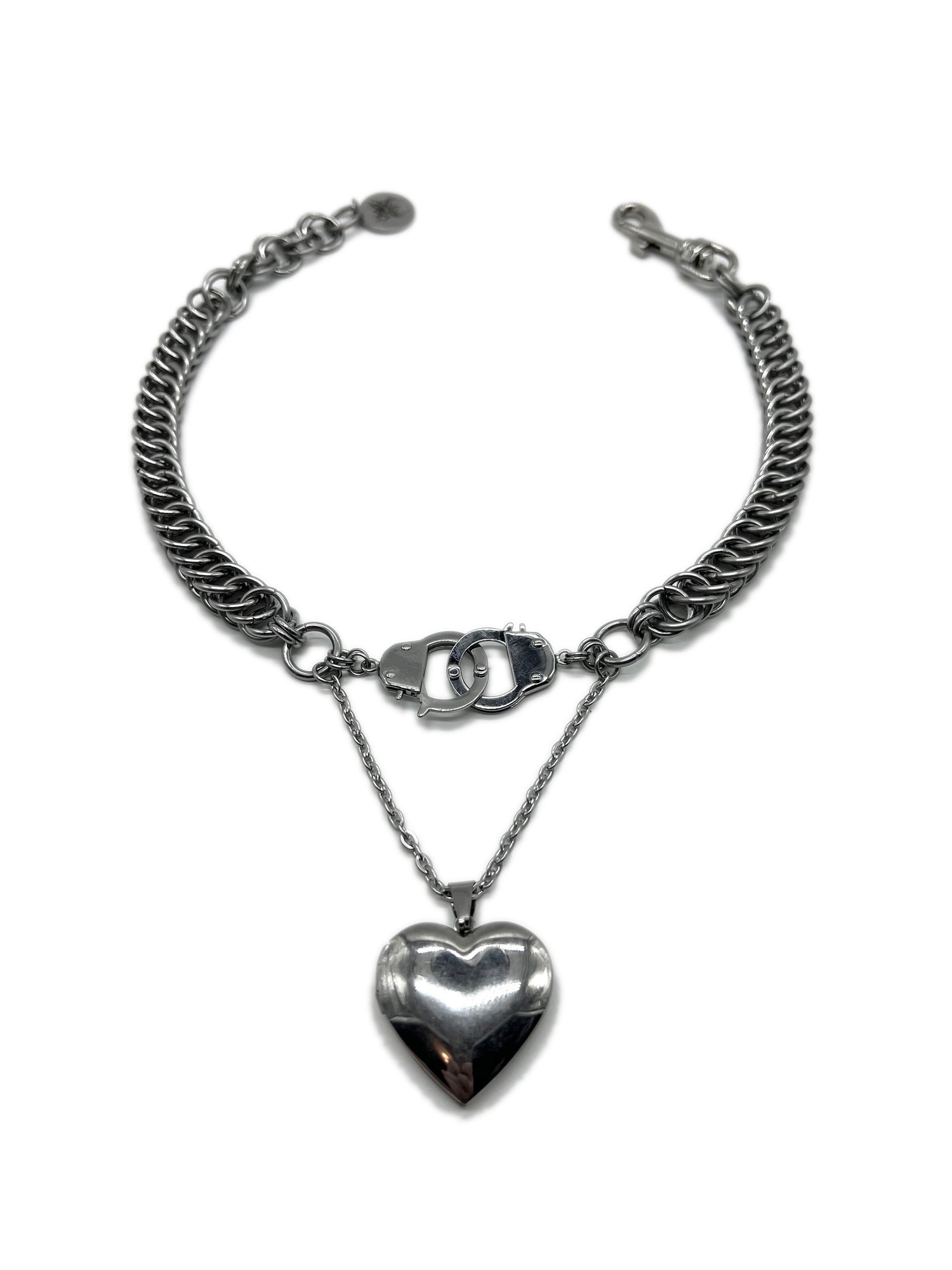 Heavy Duty Stainless Steel Chainmail Choker connected with twin stainless steel handcuffs on mini o-rings at the center with a plain heart locket dangling down on a machine made chain. Includes a 1.5" nickel plated clasp, a stainless steel Carnage in Bloom brand jewelry tag, and up to 1.5" of adjustable length.