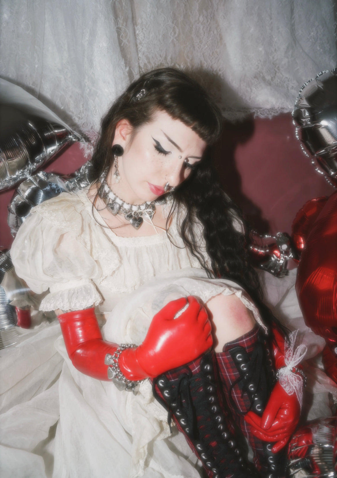 Heavy Duty Stainless Steel Chainmail Choker made from a simple 3/8" two-in-one weave decorated with a bunch of metal lockets, metal heart charms, and lace ribbons woven through. Includes a 1.5" nickel plated clasp, a stainless steel Carnage in Bloom brand jewelry tag, and up to 1.5" of adjustable length.