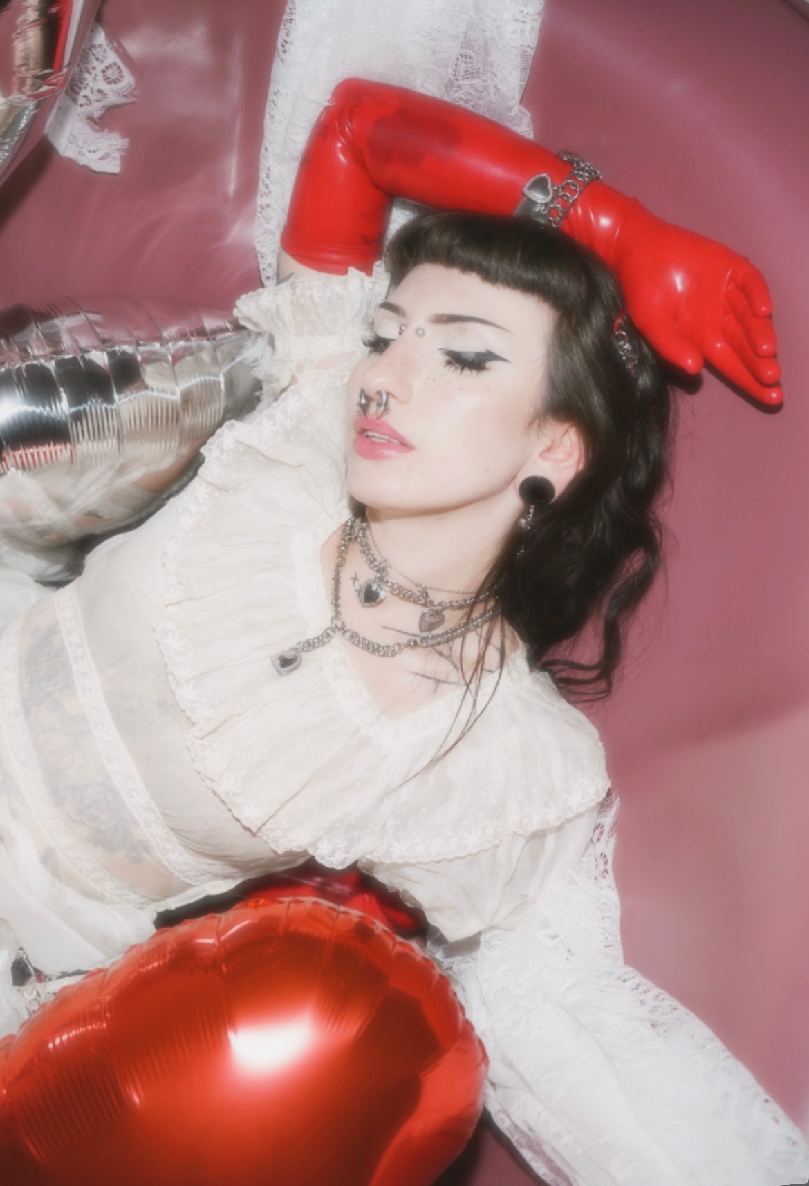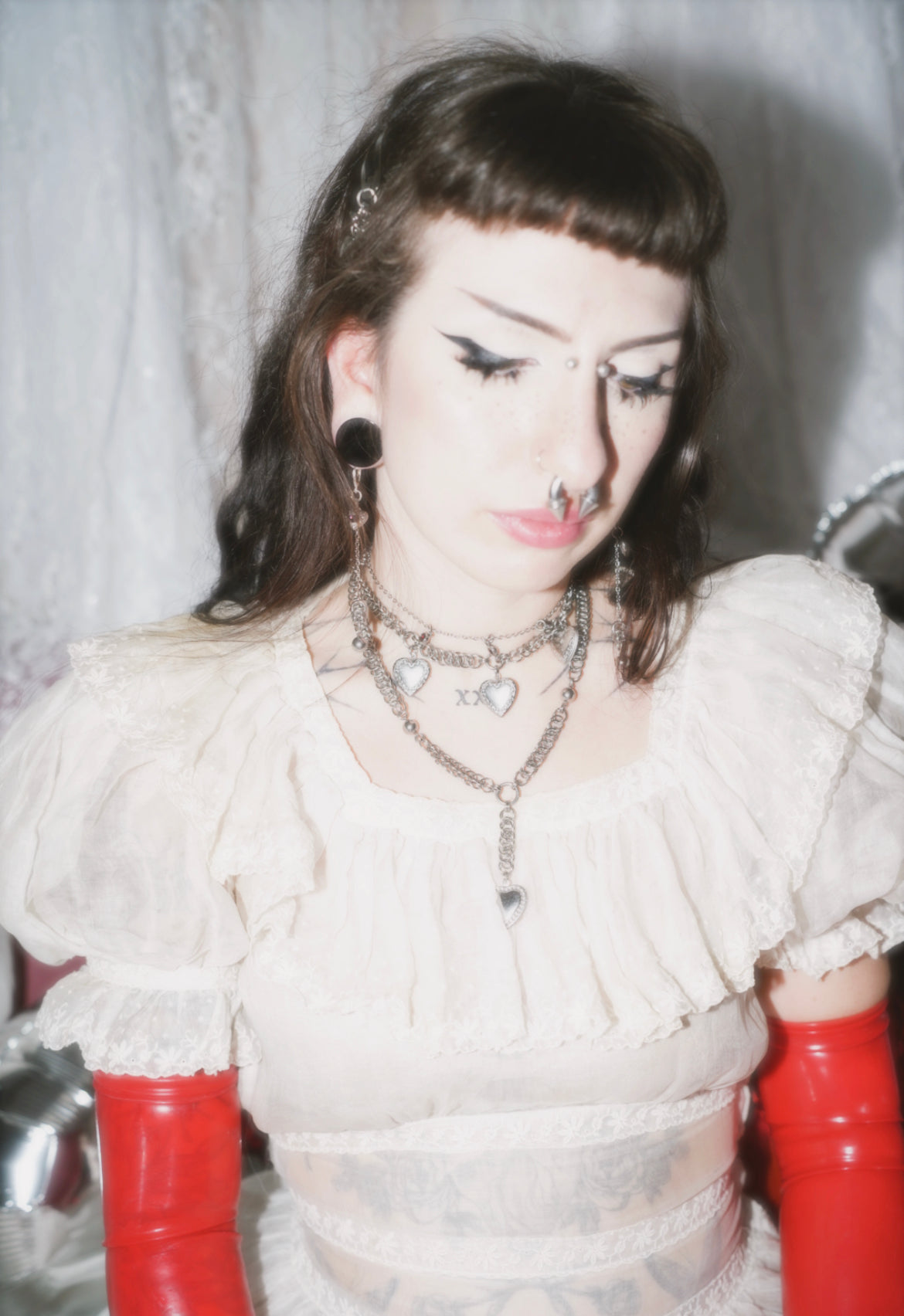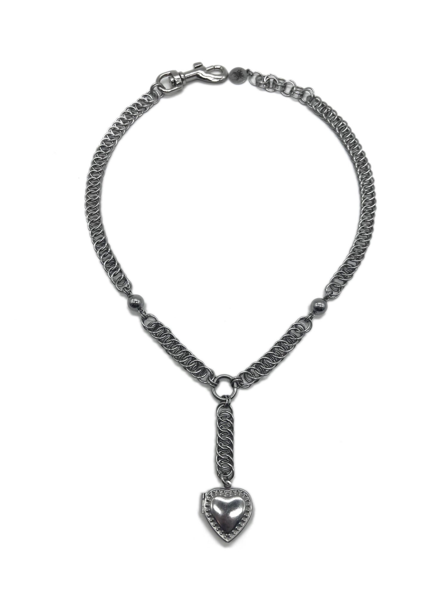 Dainty Stainless Steel Chainmail Necklace Featuring a Mini O-ring with a stainless steel heart locket hanging at the center decorated with stainless steel connector beads at either side. Includes a 1.5" nickel plated clasp, a stainless steel Carnage in Bloom brand jewelry tag, and up to 1.5 inches of adjustable length.
