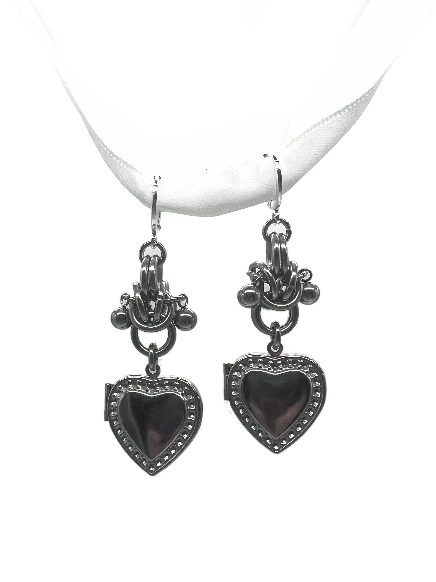 Sweet Chainmail earrings featuring metal lockets dangling from a chainmail floret decorated with some stainless steel beads completed with a round lever back nickel free earring hook for pierced or stretched ears.