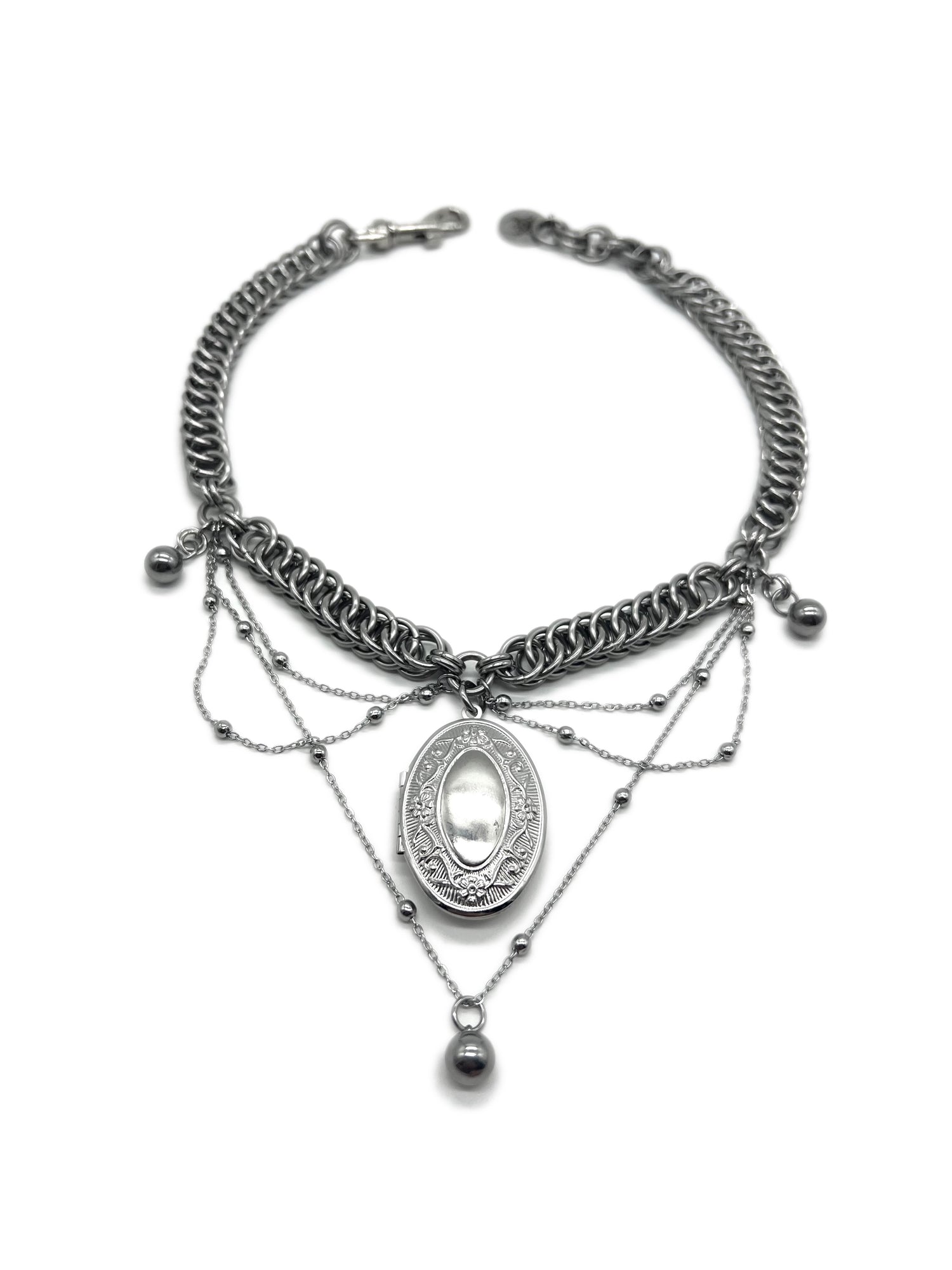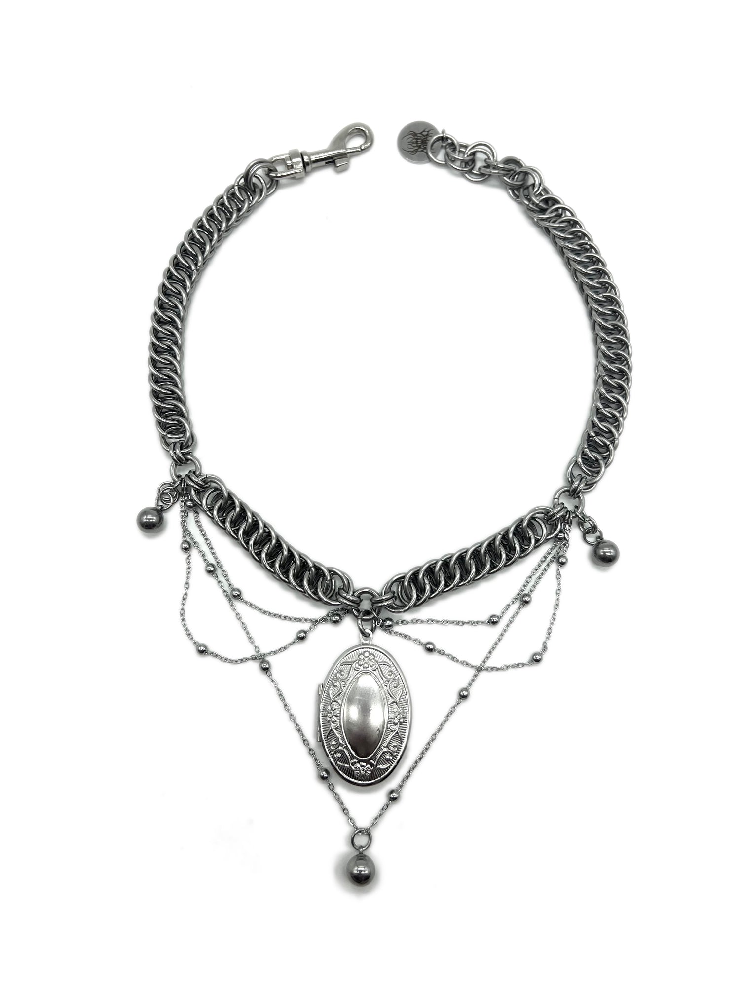 Heavy Duty Stainless Steel Chainmail Choker With A Large decorative stainless steel oval locket on a mini o-ring at the center highly decorated with beaded machine made stainless steel chains and three large steel beads. Includes a 1.5" nickel plated clasp, a stainless steel Carnage in Bloom brand jewelry tag, and up to 1.5" of adjustable length.
