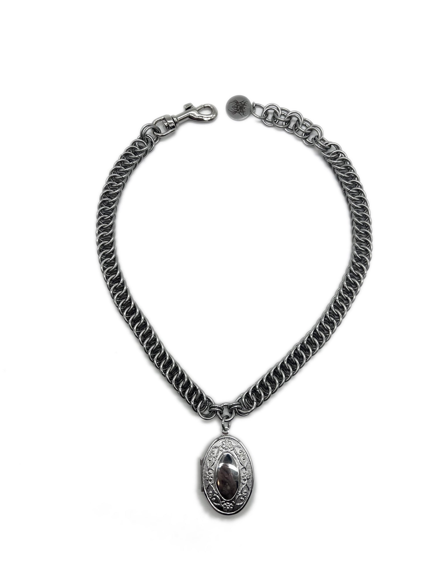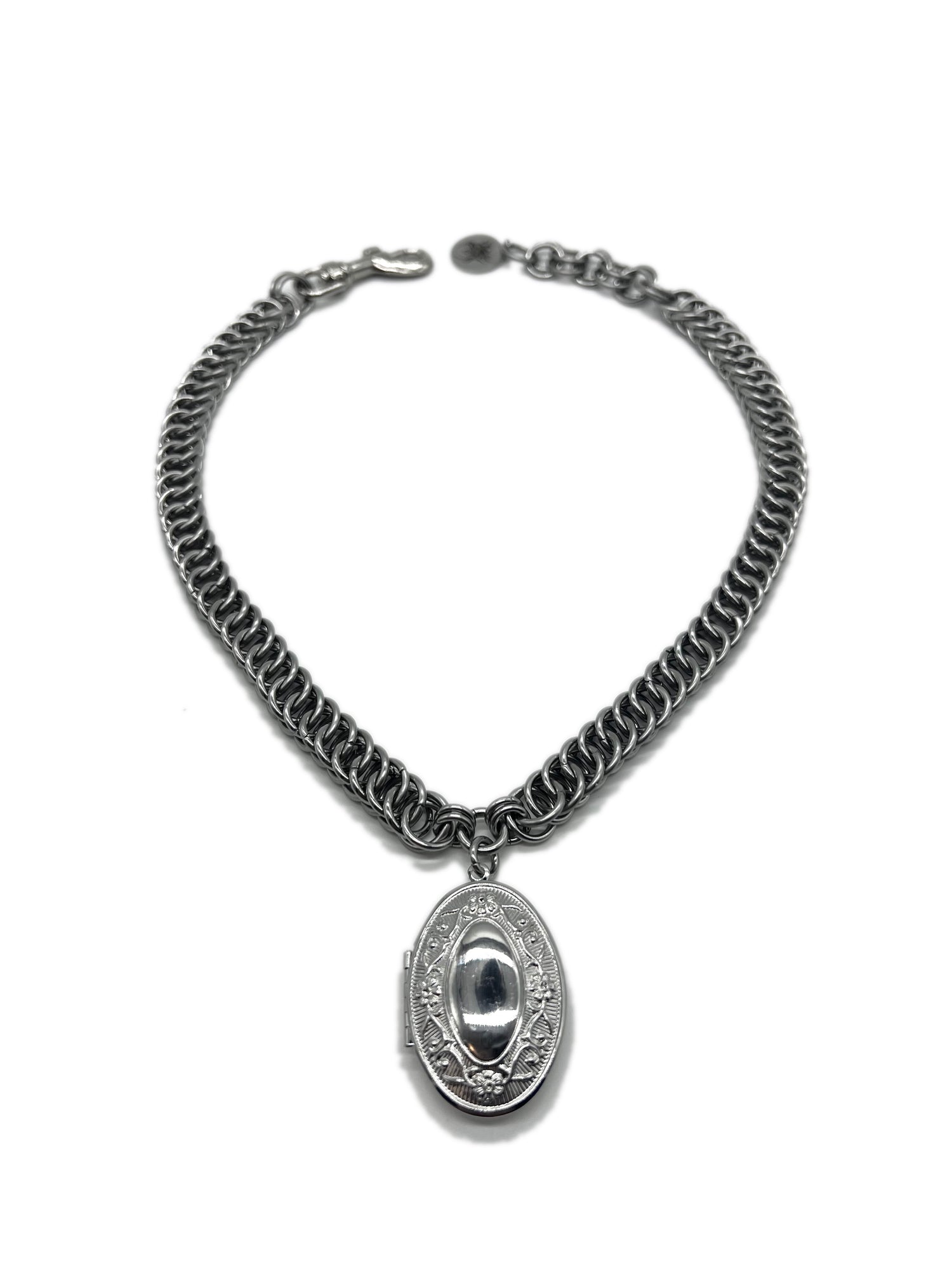 Heavy Duty Stainless Steel Chainmail Choker Decorated With A Large decorative stainless steel oval locket on a mini o-ring at the center. Includes a 1.5" nickel plated clasp, a stainless steel Carnage in Bloom brand jewelry tag, and up to 1.5" of adjustable length.