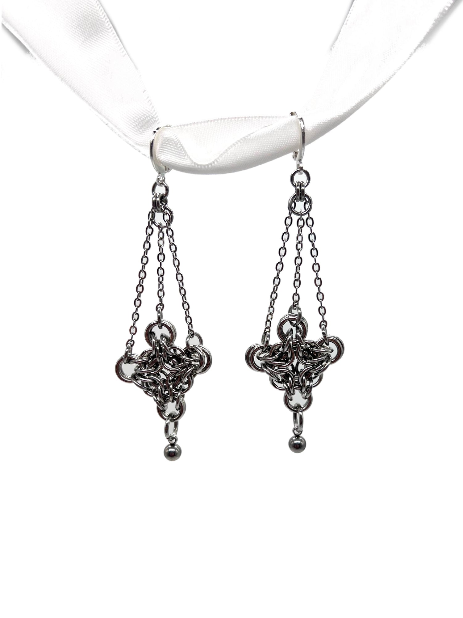 Hand-woven Chainmail Diamond-Shaped charm decorated with a stainless steel bead dangling from a small piece of machine made chain with a round lever back nickel free earring hook for pierced or stretched ears.